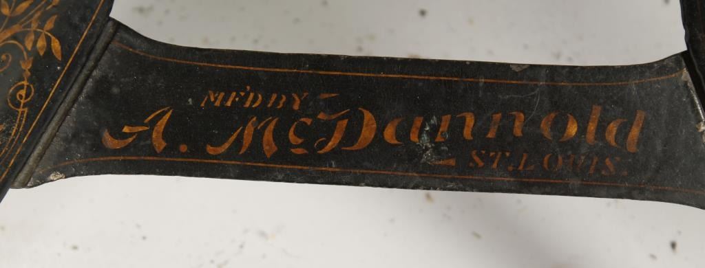 .Black painted metal with hand painted gold accents with a floral motif. Maker marked. Excellent condition and Antique Shaving Stand .Black painted metal with storage bin for tools, good overall missing mirror.
