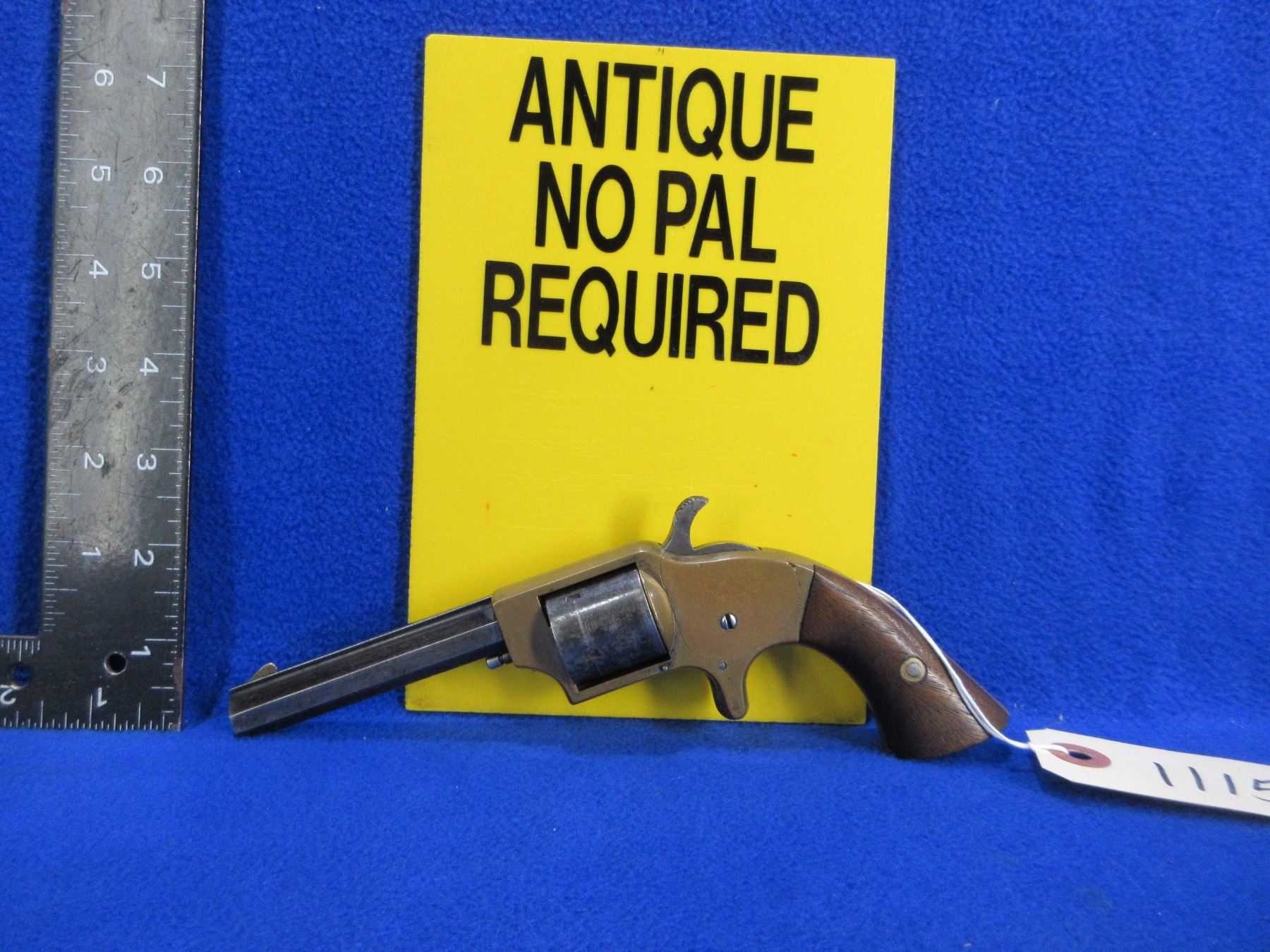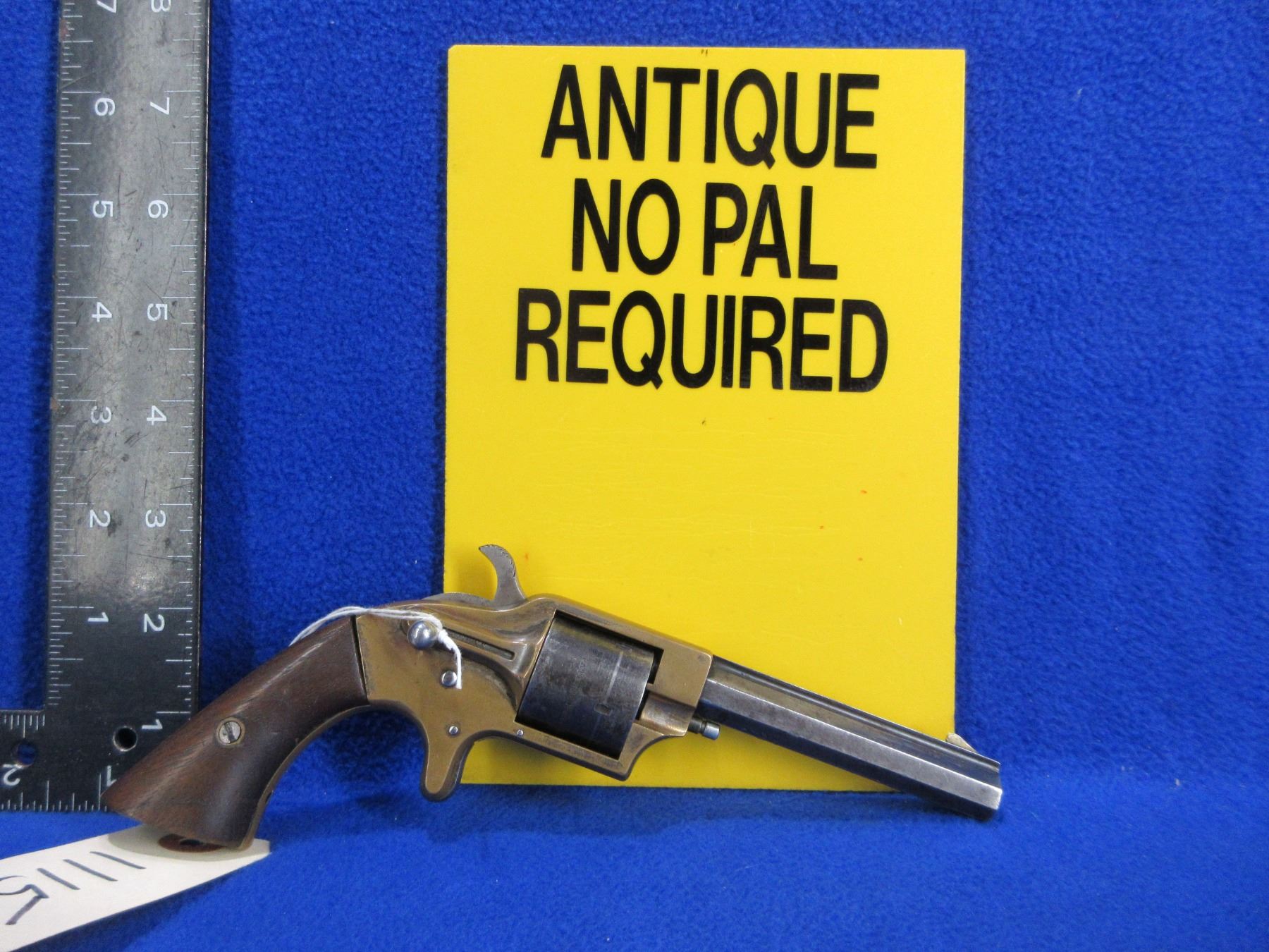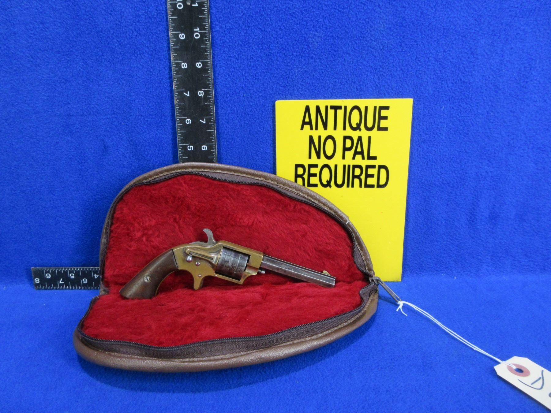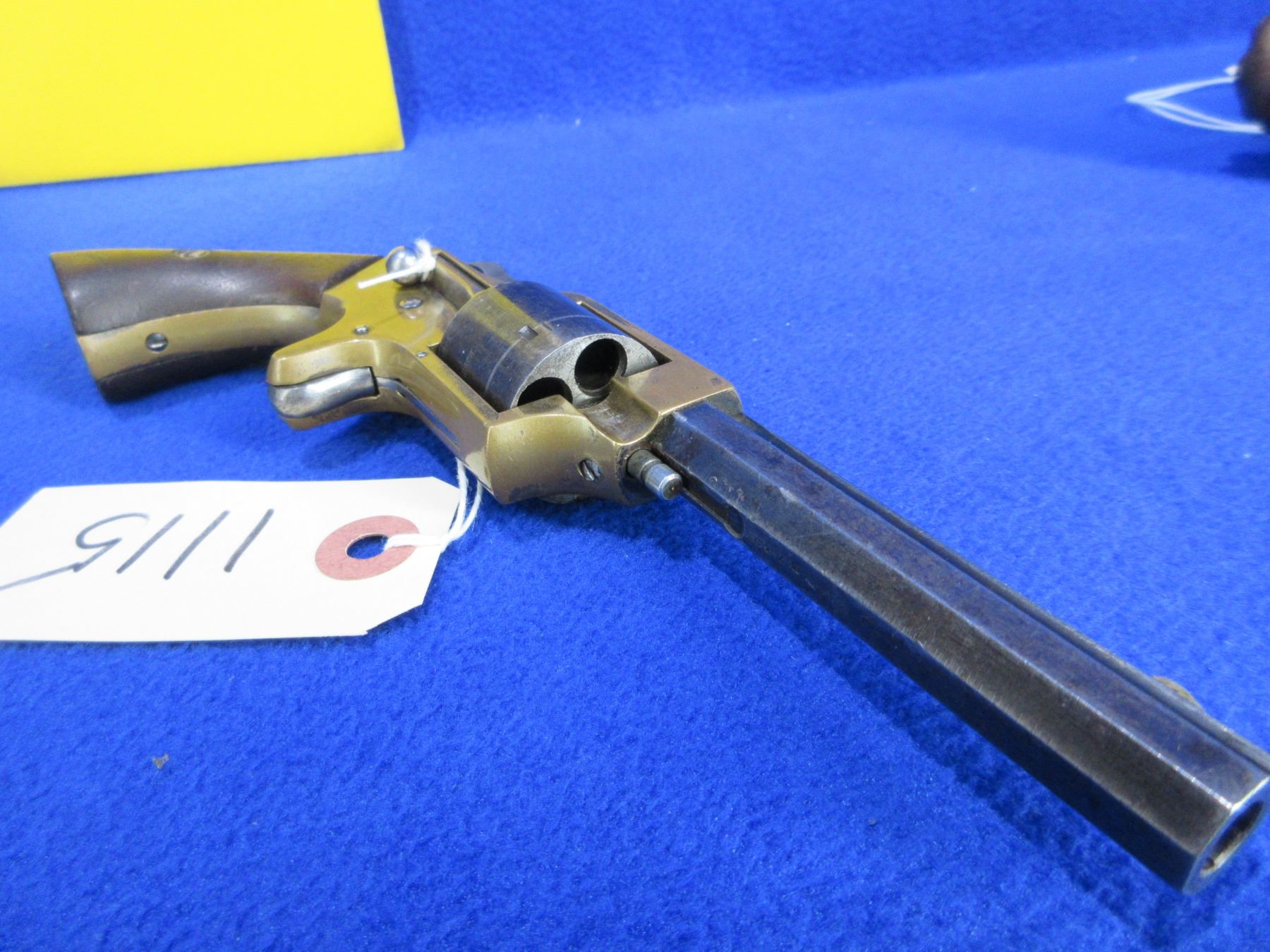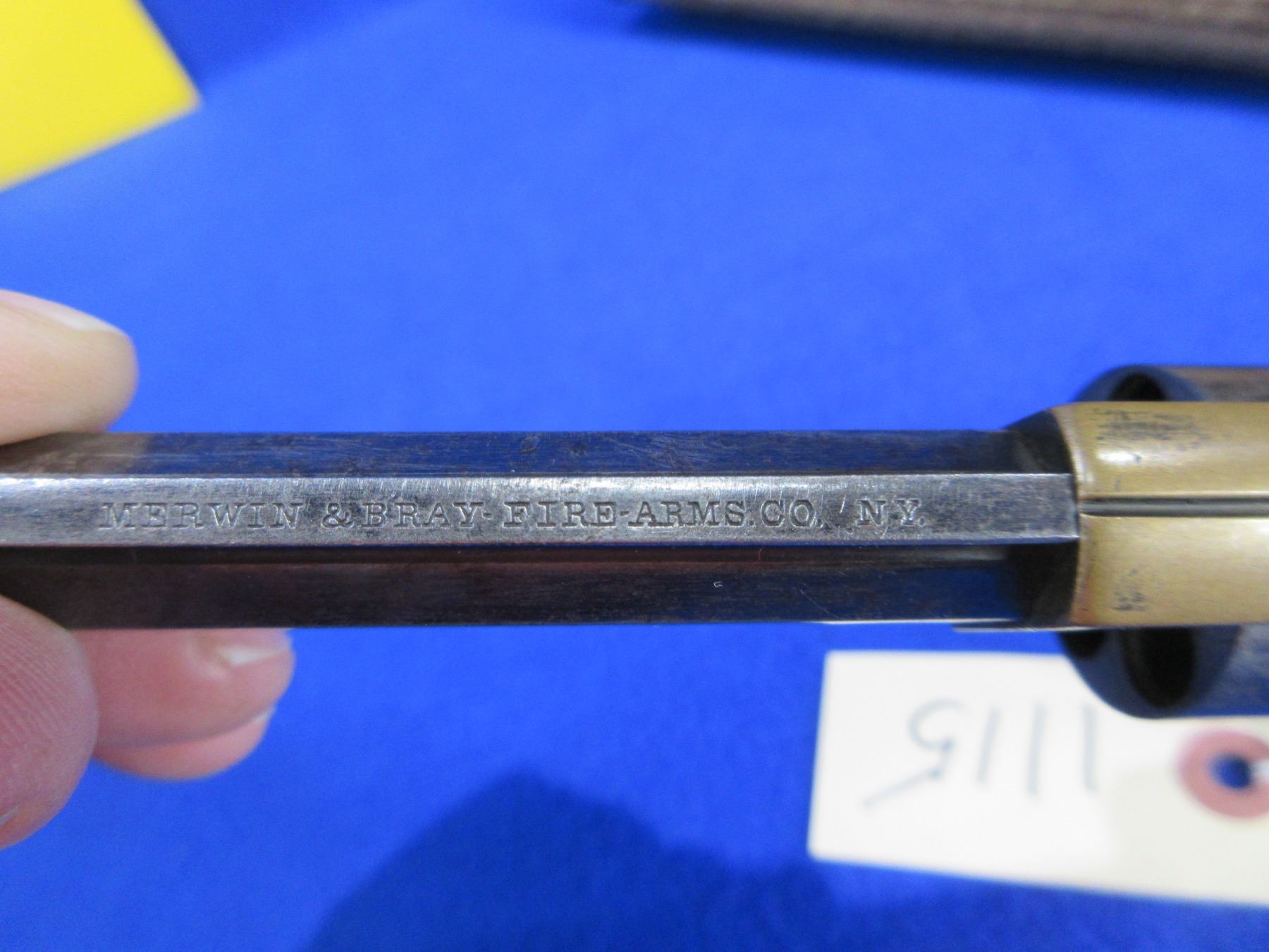 Antique - No PAL Required - Merwin & Bray Cup Fire in 30 Cal. - This five shot single action pistol appears to be in good to very good working order. Octagon barrel is 3 1/2", barrel calipers at approx. .275", cylinders at approx. .295". Rifling is good for age, barrel finish is good for age, brass action is good for age, has single blade sight, spur trigger, wood grips are good for age. Comes with soft case. Ser # 3735
