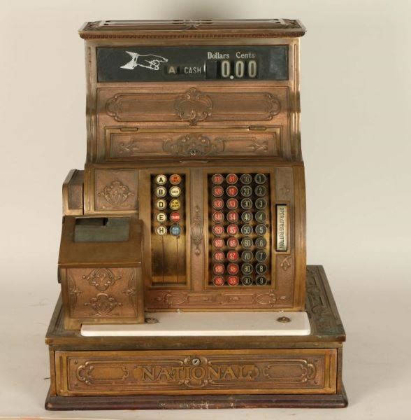All brass case maker marked, also marked '1299152 1064-G'. Measures 22 1/2" x 15" x 18 1/2" in working condition. Has a 2" piece of missing glass on cover to receipt dispenser.