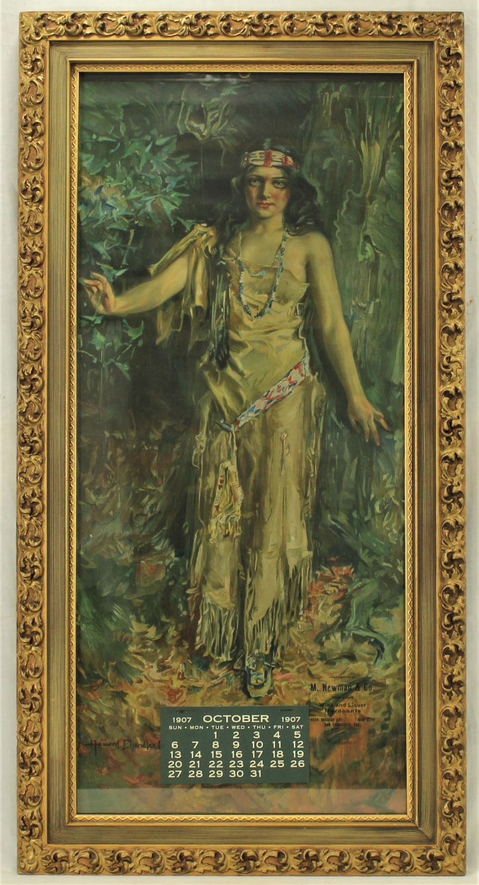 An original 1907 advertising calendar depicting risqué Indian maiden, advertising "M. Newman & Co., Wine and Liquor Merchants, San Francisco CA", image signed Howard Chandler, showing brilliant color and superb condition. Dimensions 17"x 33".