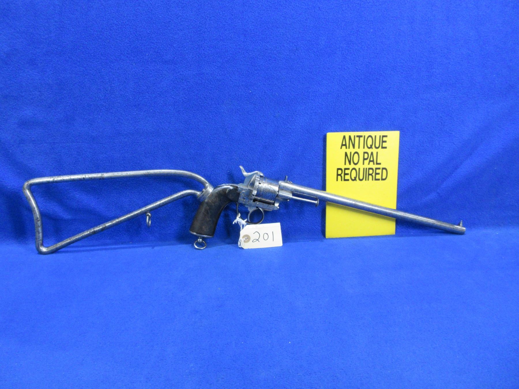 Antique - No PAL Required - E. LeFauckeux Pinfire (appears to be in 11mm) Revolver - Anyone can own this nicely engraved antique revolver. This 6 shot double action revolver appears to be in working order. Barrel is 14", rifling is fair to good for age, silver finish has pitting, has both sights, wood grip has chips around the rear tang, comes with metal shoulder stock. Ser # None