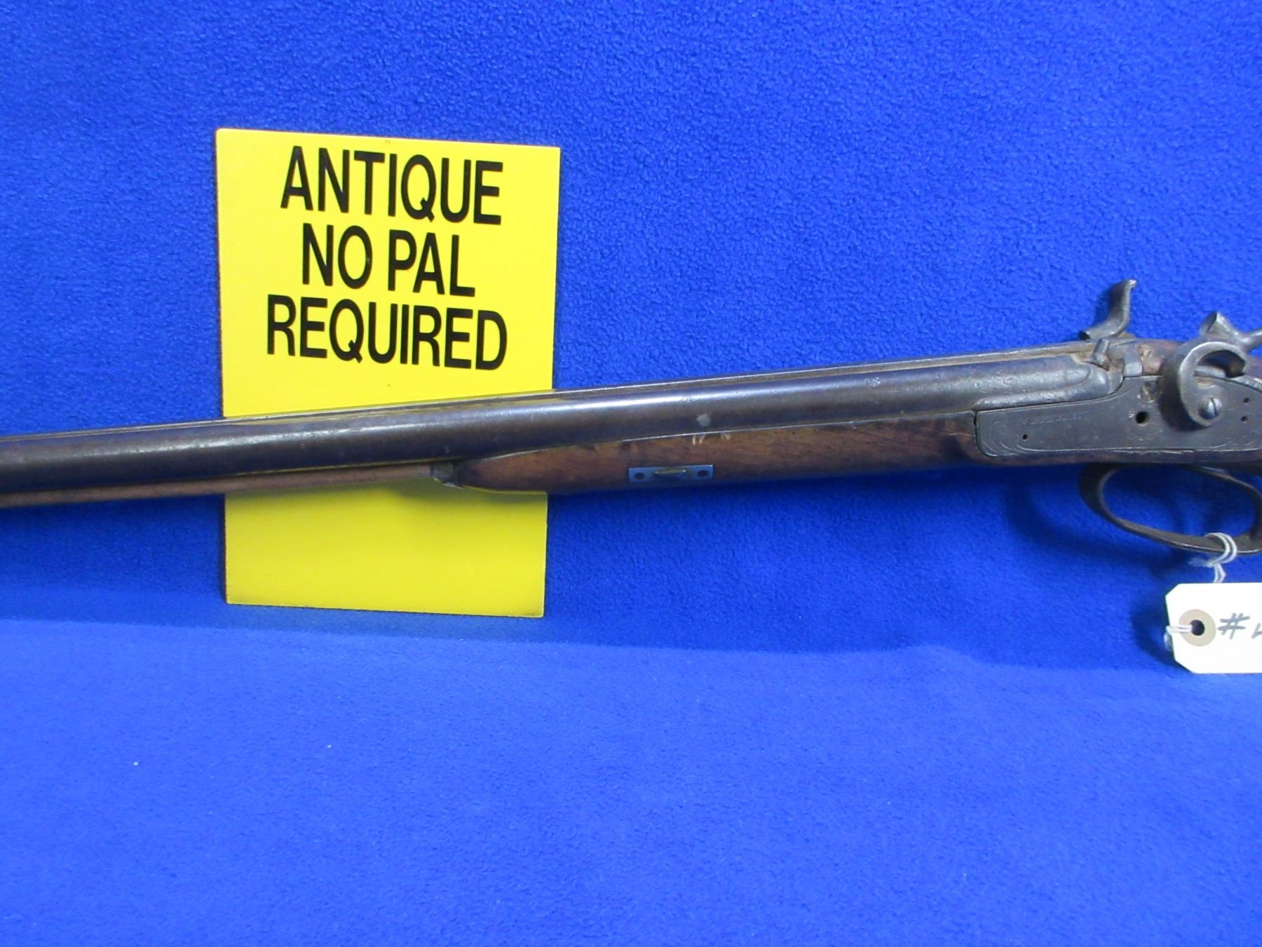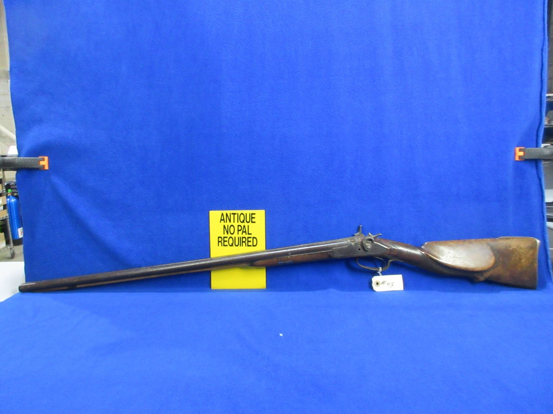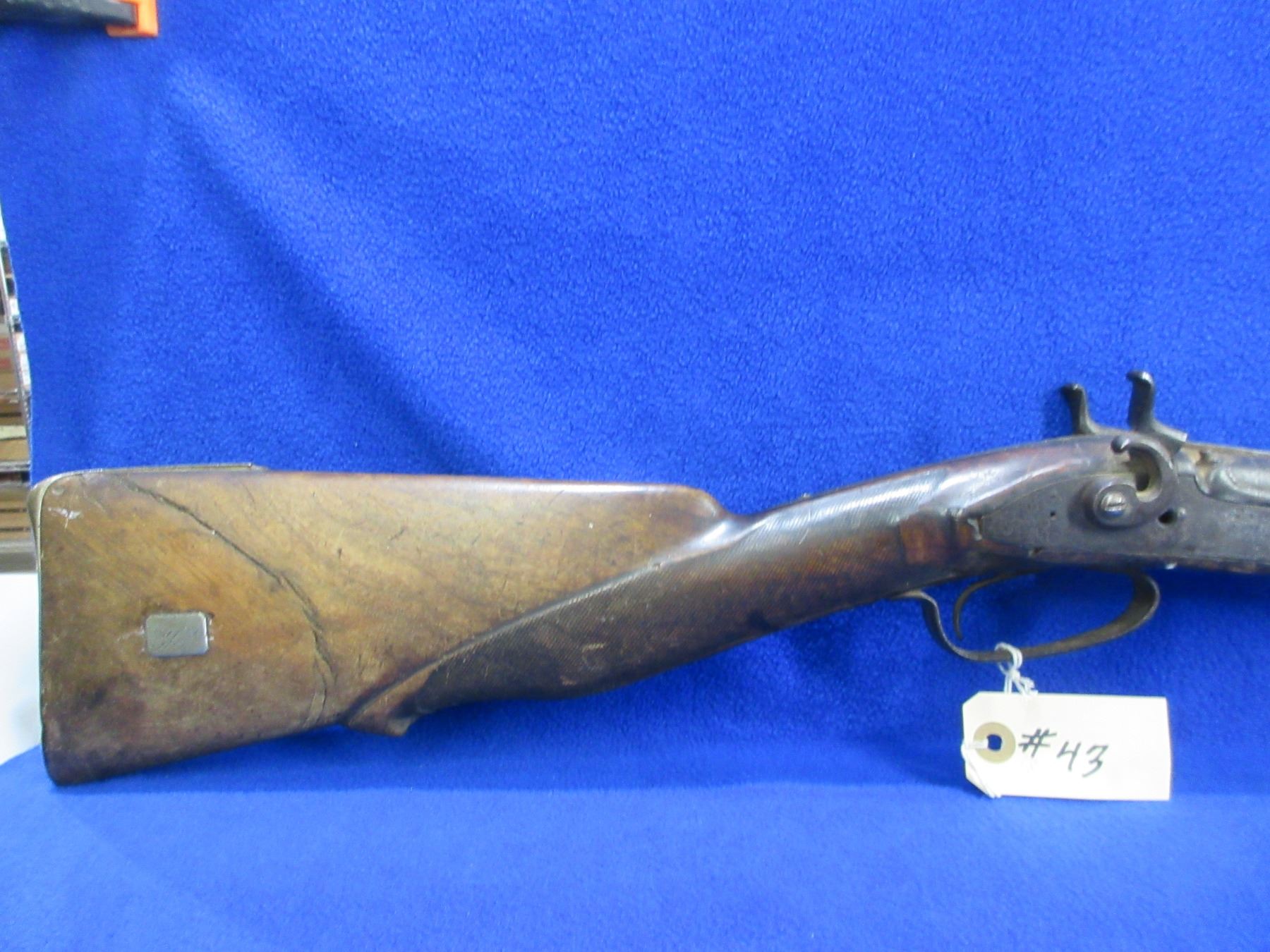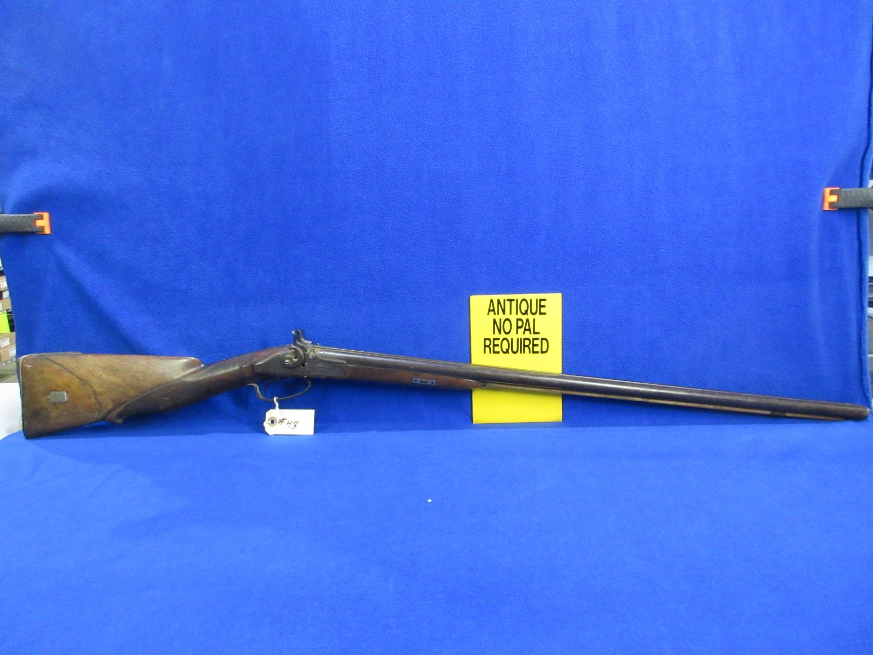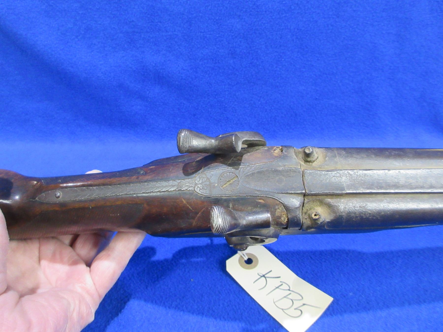 Antique - No PAL Required - IN Breslau SXS Muzzleloader in appears to be 16 Ga. - This is a muzzleloading SXS hammer shotgun is a wall hanger/parts gun as hammers and trigger are not working and stock is cracked. Barrels are 30 1/2", bores are unknown as covered in dust (needs wet cleaning), bluing has rust and pitting, has bead front sight, stock is cracked under the trigger guard and has drying cracks on the butt end, brass butt plate good, comes with incorrect ram rod. Ser # None