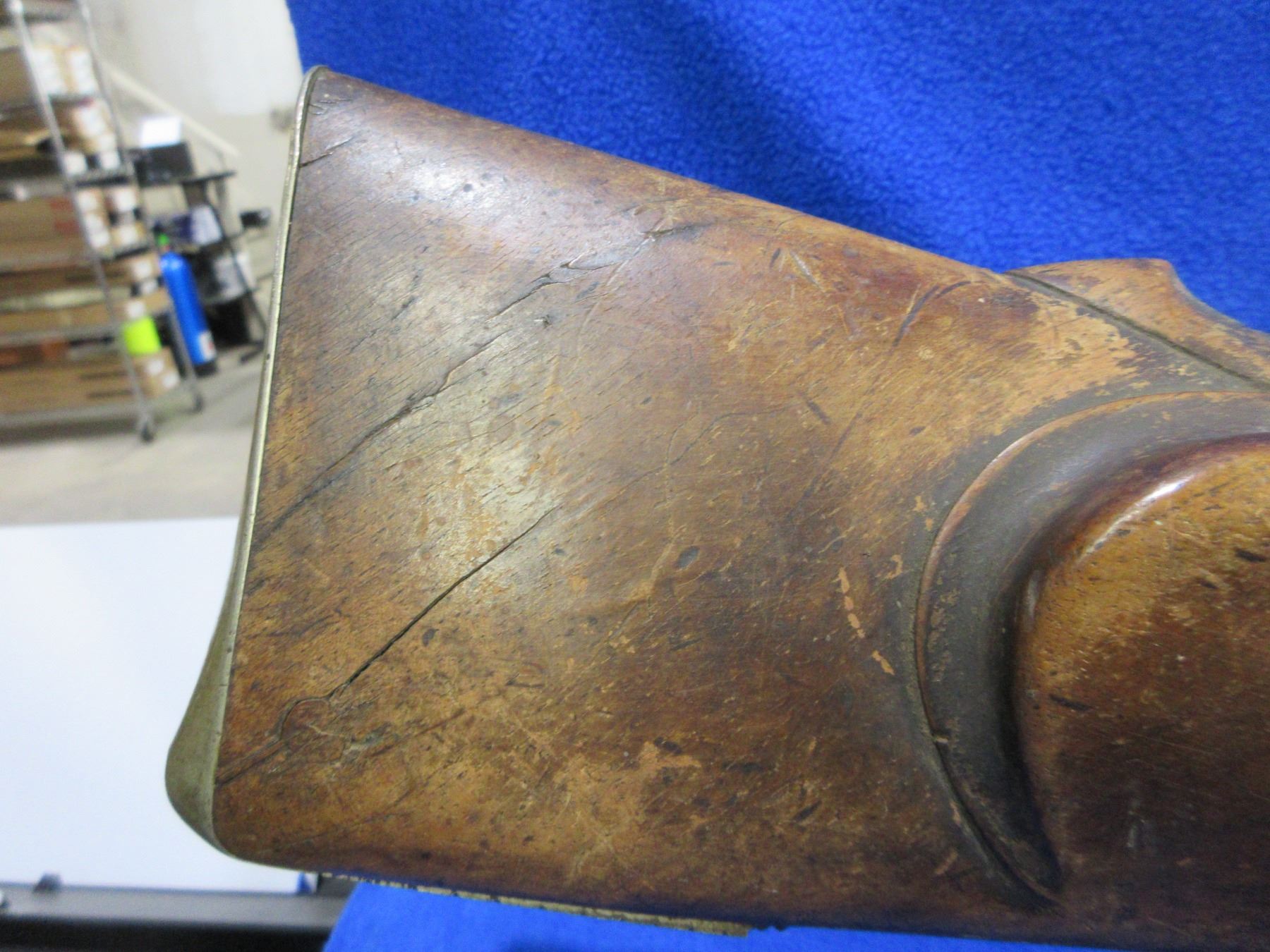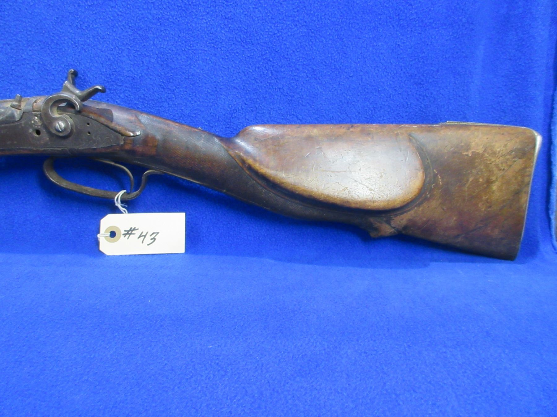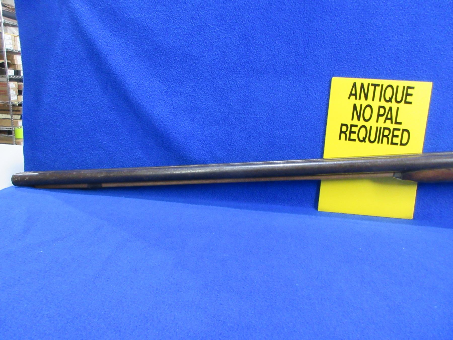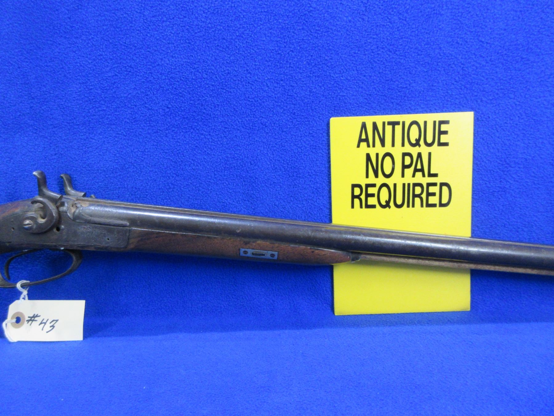 Antique - No PAL Required - IN Breslau SXS Muzzleloader in appears to be 16 Ga. - This is a muzzleloading SXS hammer shotgun is a wall hanger/parts gun as hammers and trigger are not working and stock is cracked. Barrels are 30 1/2", bores are unknown as covered in dust (needs wet cleaning), bluing has rust and pitting, has bead front sight, stock is cracked under the trigger guard and has drying cracks on the butt end, brass butt plate good, comes with incorrect ram rod. Ser # None
