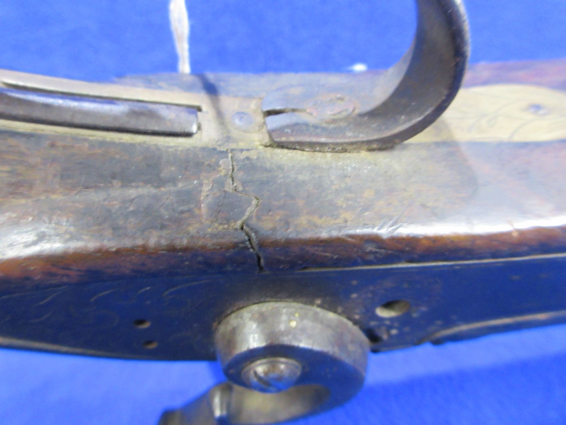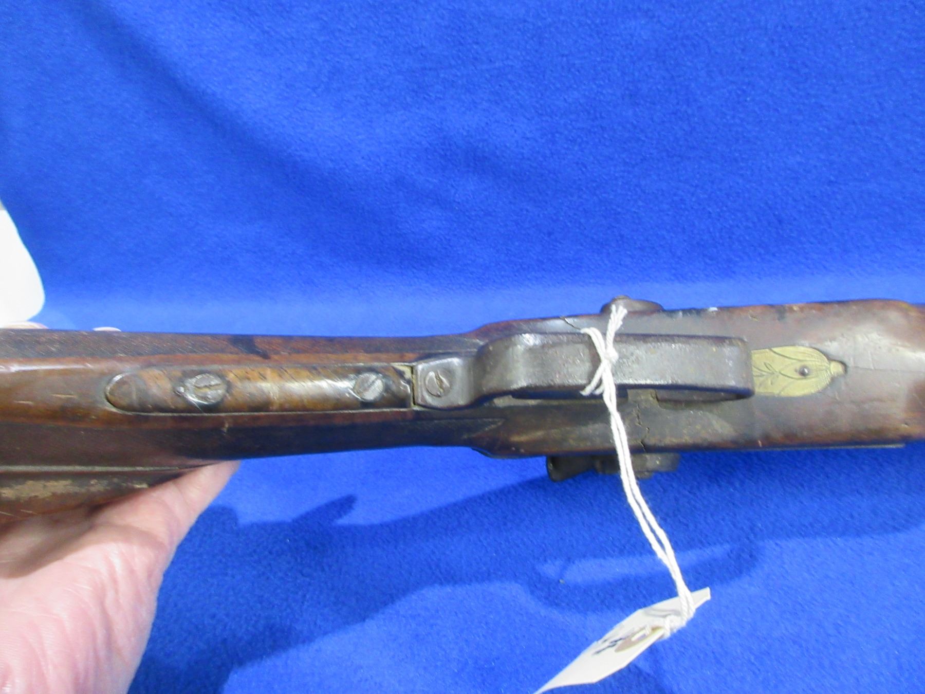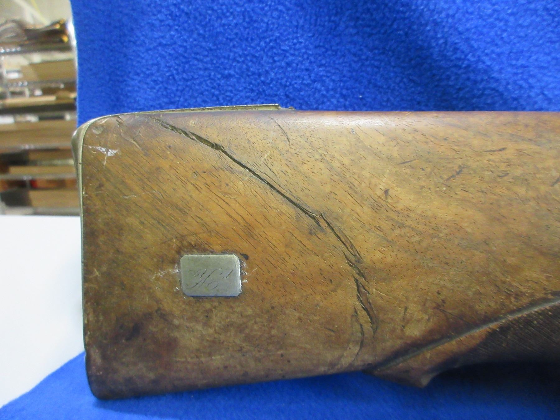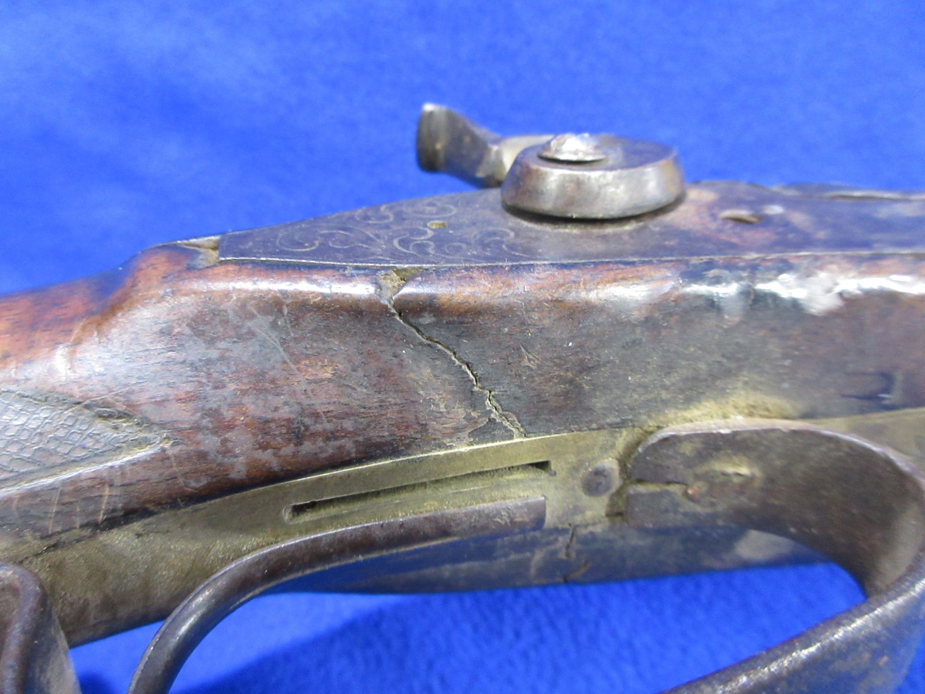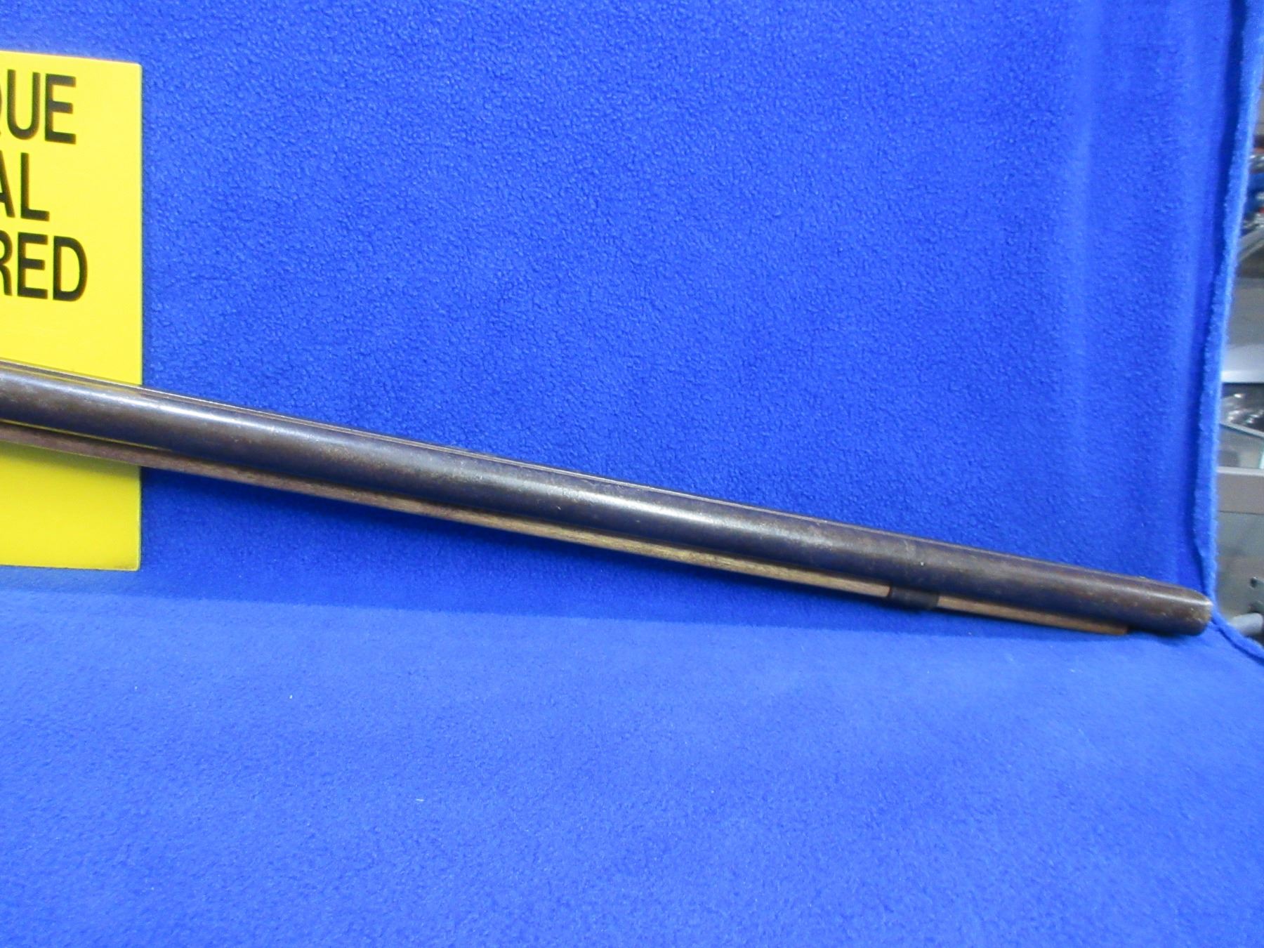 Antique - No PAL Required - IN Breslau SXS Muzzleloader in appears to be 16 Ga. - This is a muzzleloading SXS hammer shotgun is a wall hanger/parts gun as hammers and trigger are not working and stock is cracked. Barrels are 30 1/2", bores are unknown as covered in dust (needs wet cleaning), bluing has rust and pitting, has bead front sight, stock is cracked under the trigger guard and has drying cracks on the butt end, brass butt plate good, comes with incorrect ram rod. Ser # None