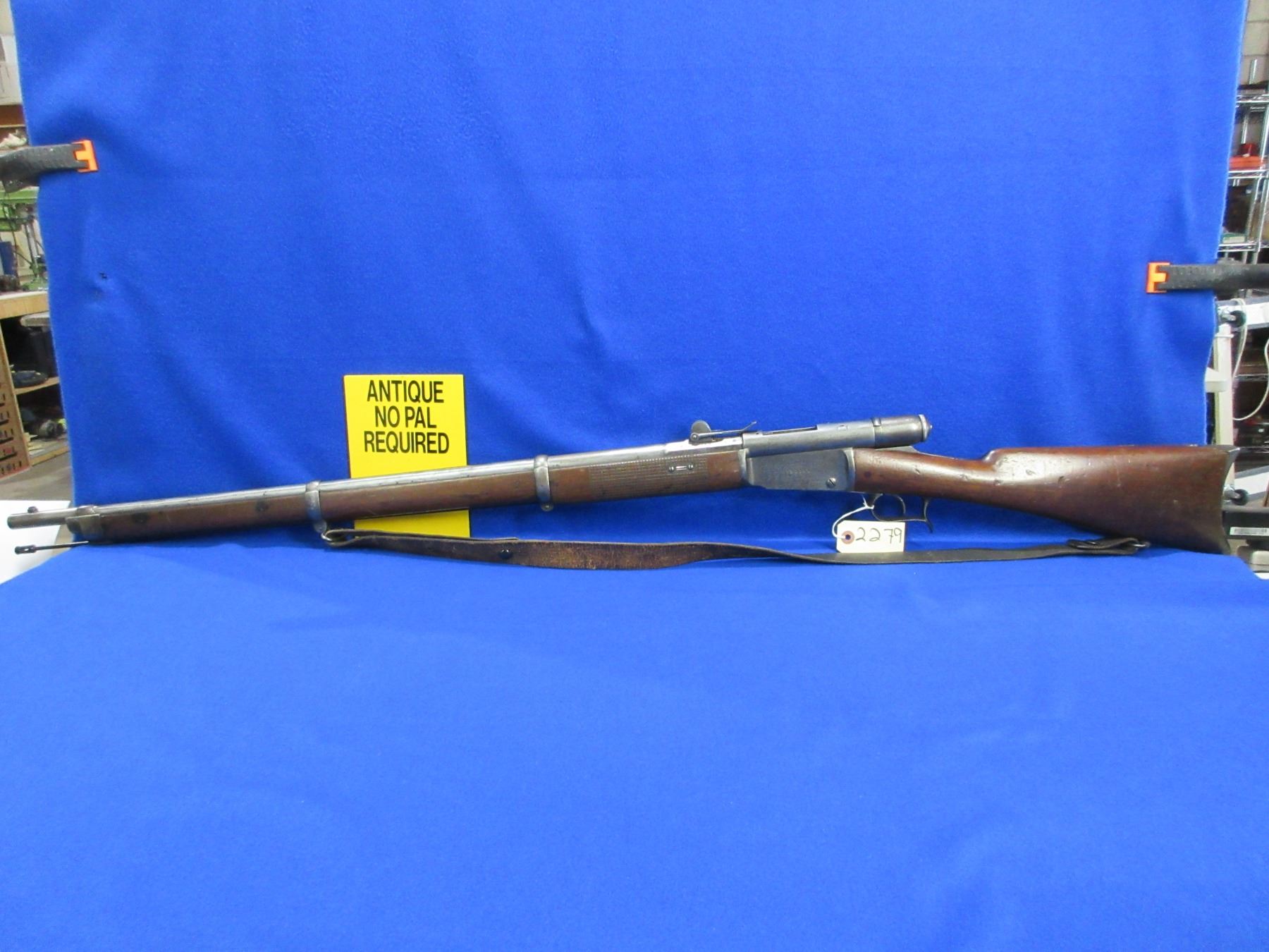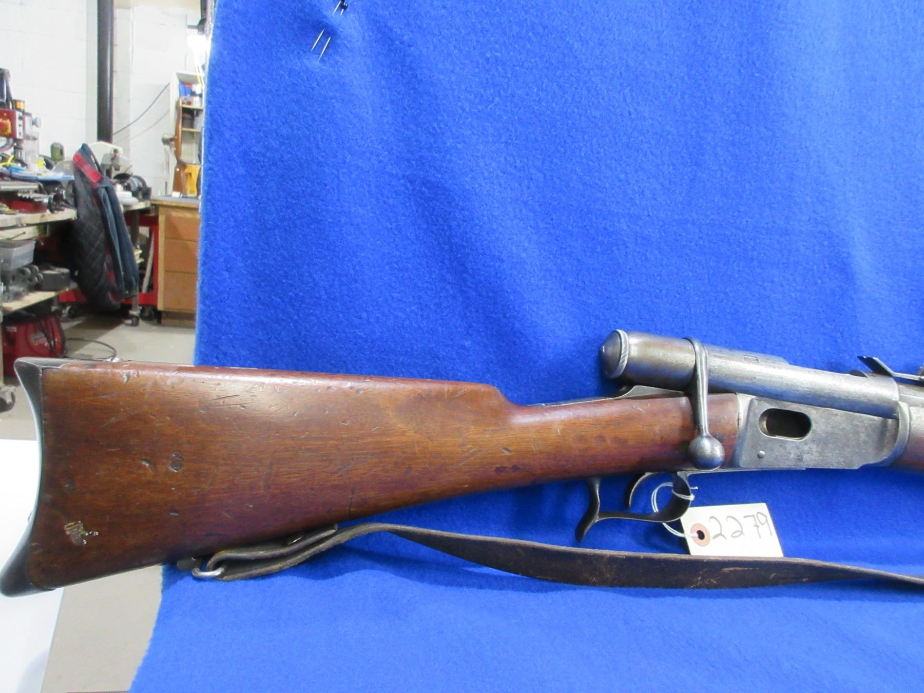 Antique - No PAL Required - Swiss Vetterli 1869/71 in 10.4x38mm Rim Fire - This 1 of 36,700 built bolt action rifle with 11 round tube magazine appears to be in good working order . 33" barrel. rifling is fair, bluing is gone, has both sights, full wood stock is good for age with many usage marks but forearm is cracked, metal crescent butt plate good, comes with cleaning rod, swivels and leather sling. Ser # 132260