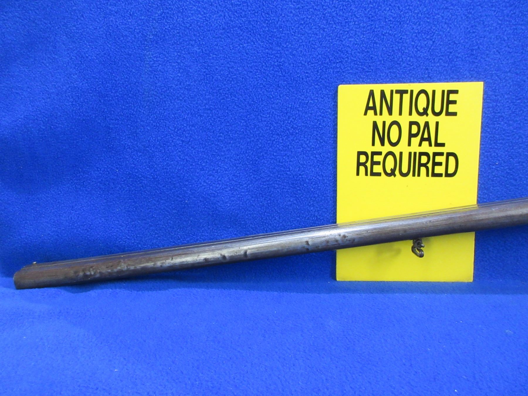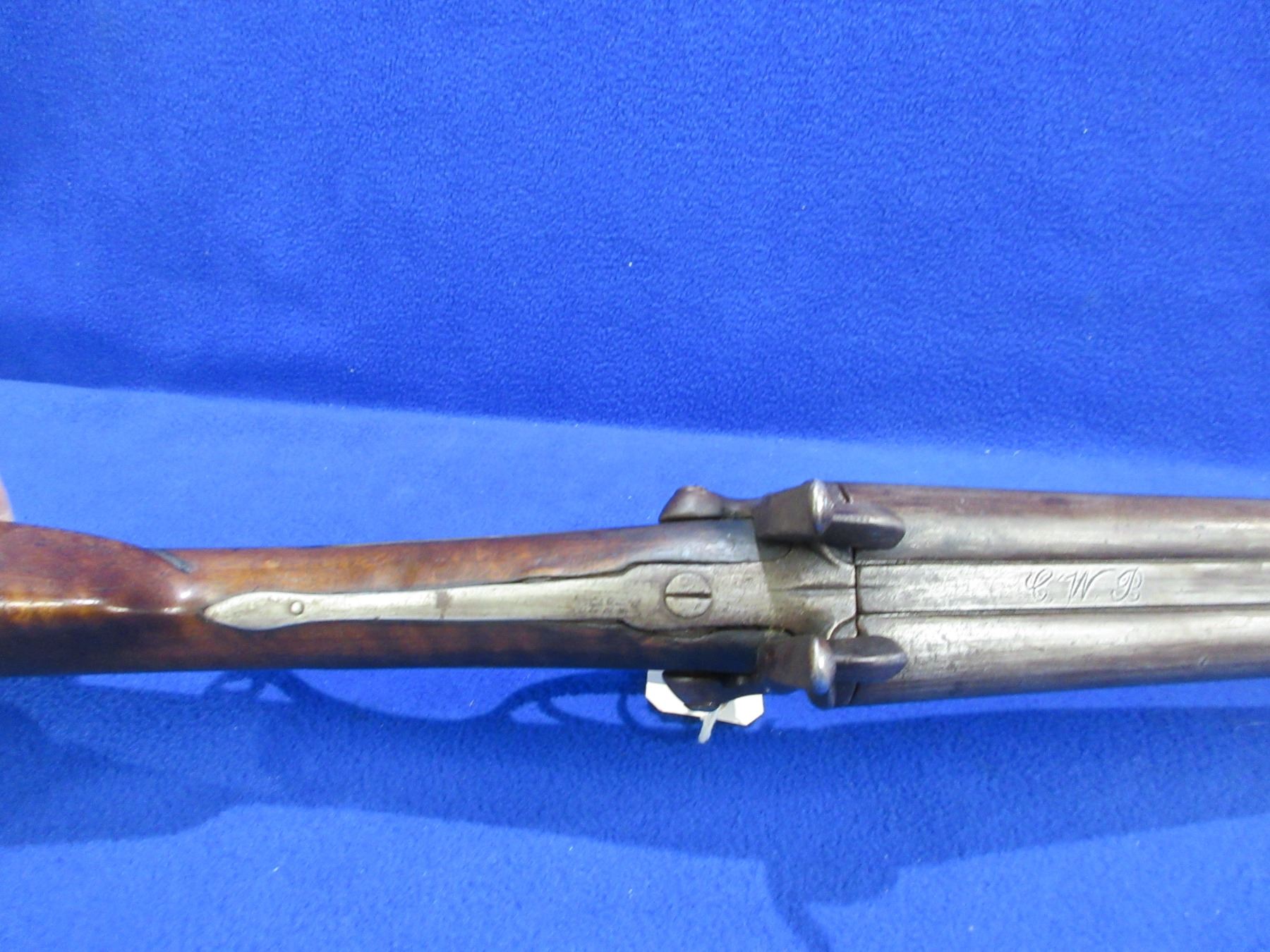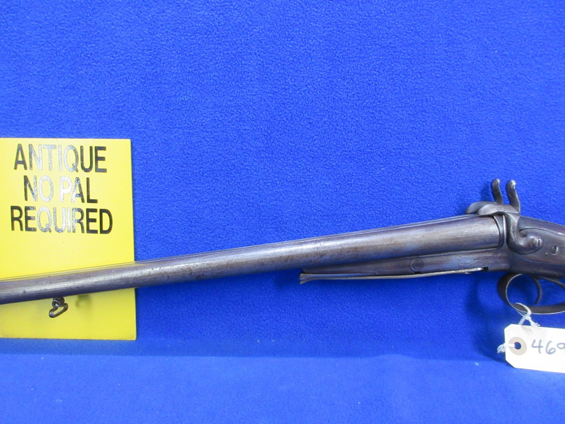 Antique - No PAL Required - Unknown Belgian Pinfire in 16 Ga. 2 1/2" - This tip up SXS pinfire hammer shotgun would make an interesting wallhanger, action is tight but there are noticeable gaps and appears to function but appears unsafe to shoot. Locking lever is not original. Barrels are 29 3/8", bores are poor with pitting and both barrels have dents, bluing is gone, has bead front sight, stock is good with many usage marks, length of pull is 14", metal butt plate is missing a screw. Ser # 1489