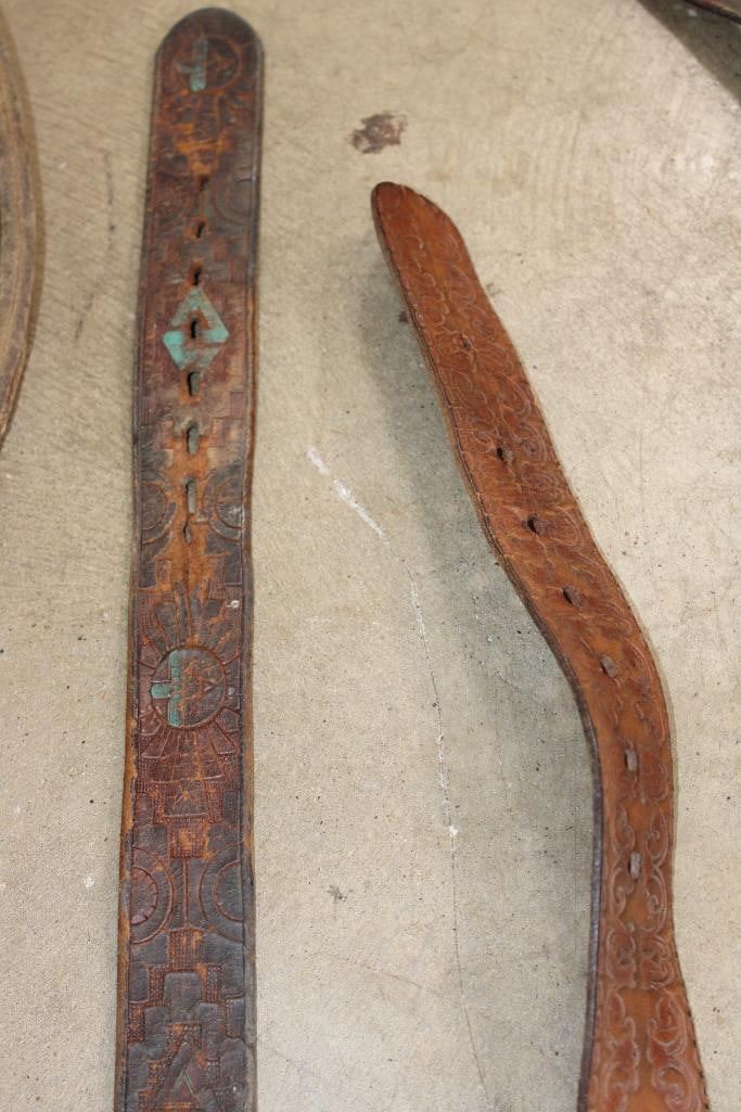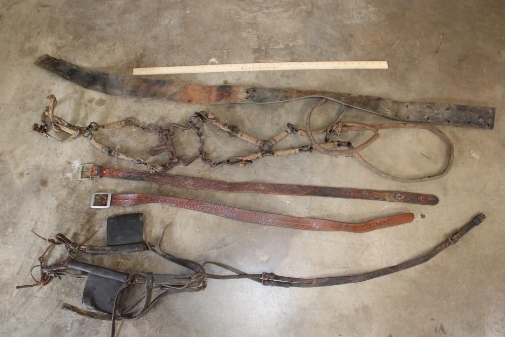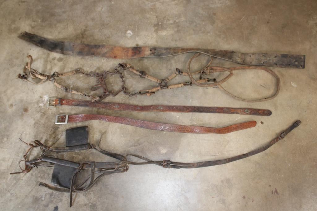 Antique "Old West" Horse Bits, Bridals, 2 Tooled Leather Belts, and a Leather Strap (ONE$)