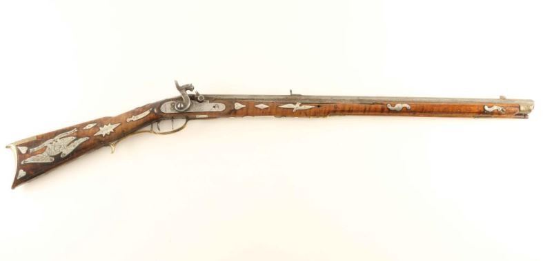 Antique boy size percussion rifle with an approximate .45 caliber bore. Features a 24" octagonal barrel, dovetailed copper blade front sight, fixed rear sight, double set triggers, unsigned lock, wood ram rod, brass furniture and a straight grip shoulder stock heavy adorned with metal inlays in the shape of diamonds, birds, daggers, hearts and more. Includes a document from a former owner stating "The black powder boys size rifle was purchased by my great grandfather Joseph John LeMoine (1852-1930) from someone who had it made for his son, but after a disagreement with the son sold it to my great grandfather. My grandfather William John LeMoine (1882-1968) hunted with it as a boy." The rifle retains little remaining finish with the majority of the metal surfaces displaying a smooth grey patina. Action is non-working, the bore is good and the wood stock is fair with scattered cracks & losses. Condition is NRA Good. ***Antique Firearm***