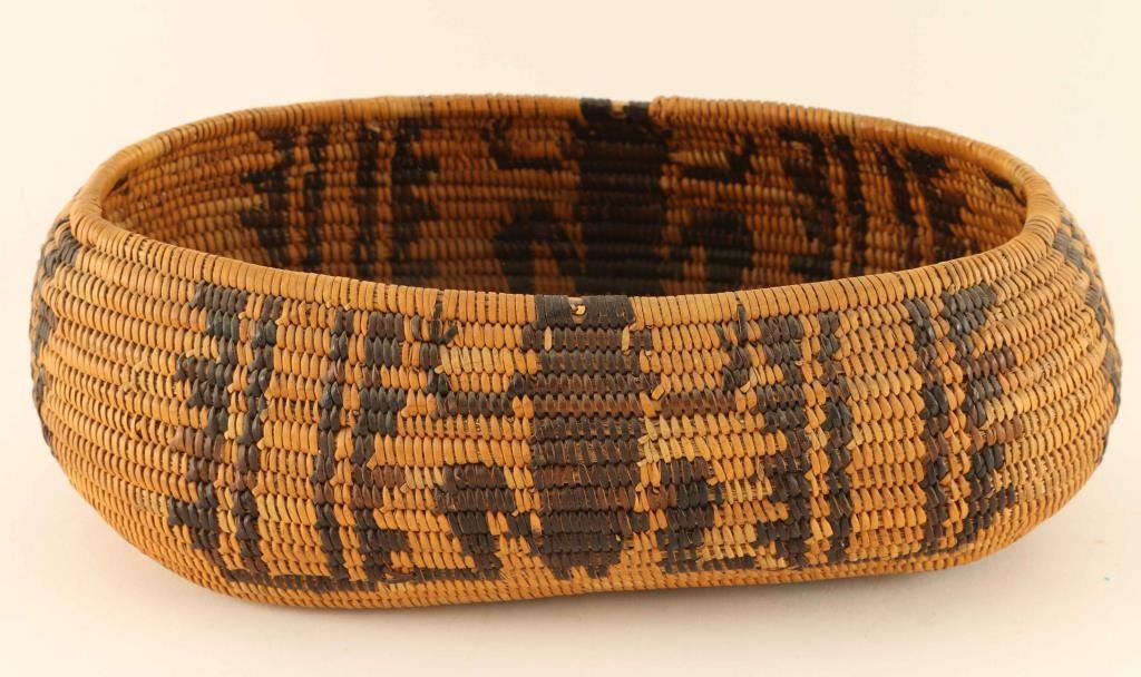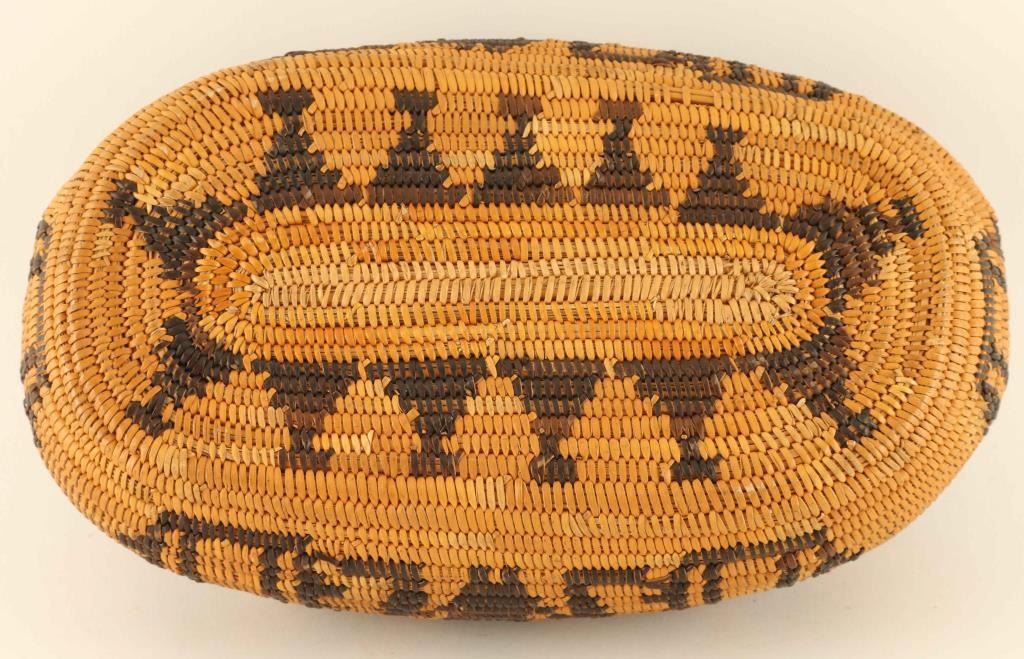 Canoe style single rod basket with geometric frog design, excellent condition, 9"x5.75"x3"