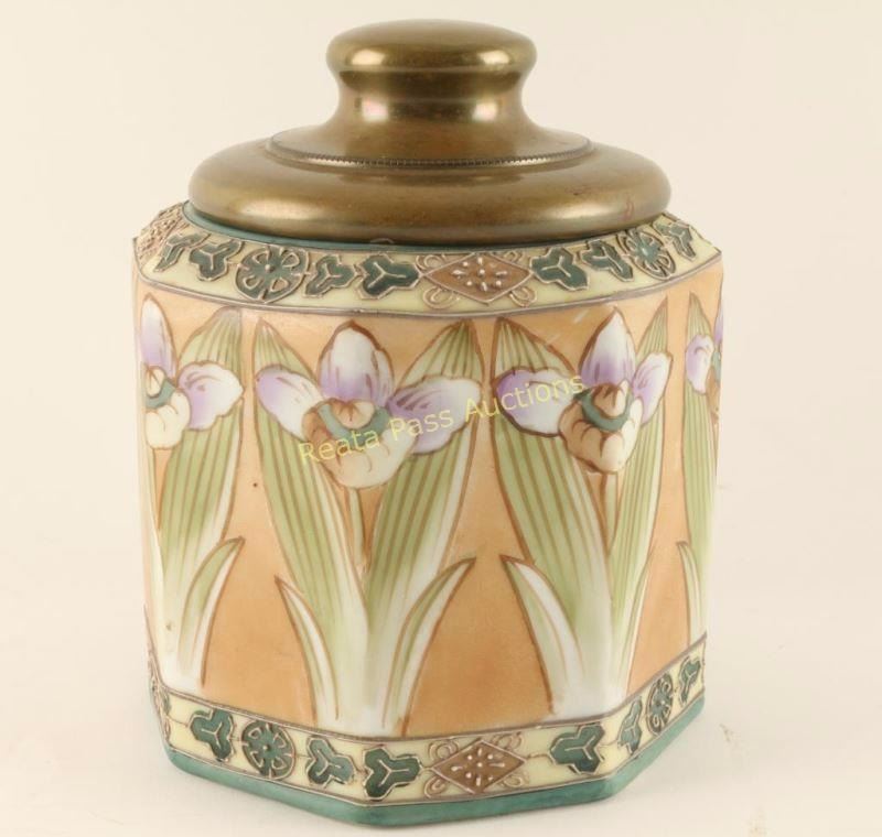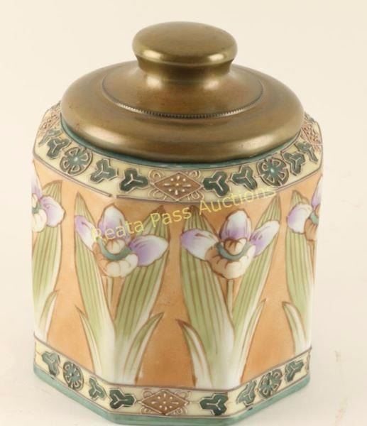 Hand painted with iris motif with brass lid. Maker marked on bottom. Measures 8"x6".