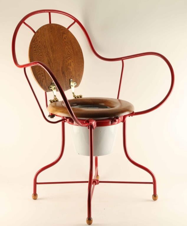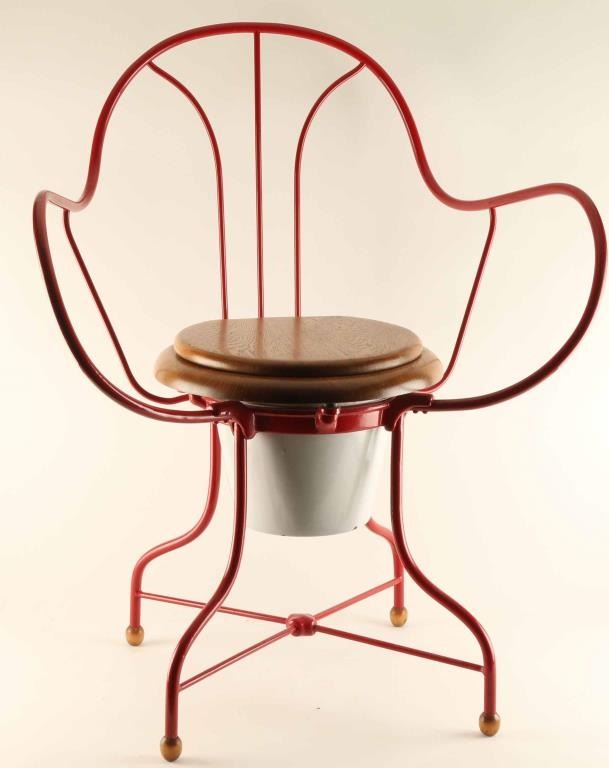 Red laqured construction with solid oak seat, white and blue enameled chamber pot. In beautiful condition as restored.
