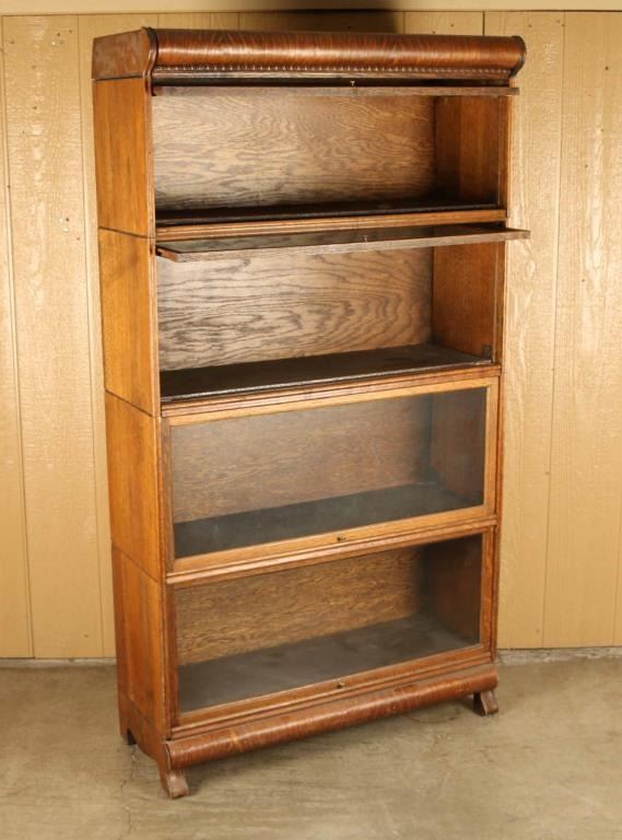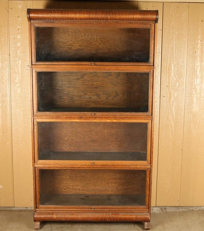 Bookcase, glass fronts that hide away, marked Bekins, good overall condition measures 12X35x65.