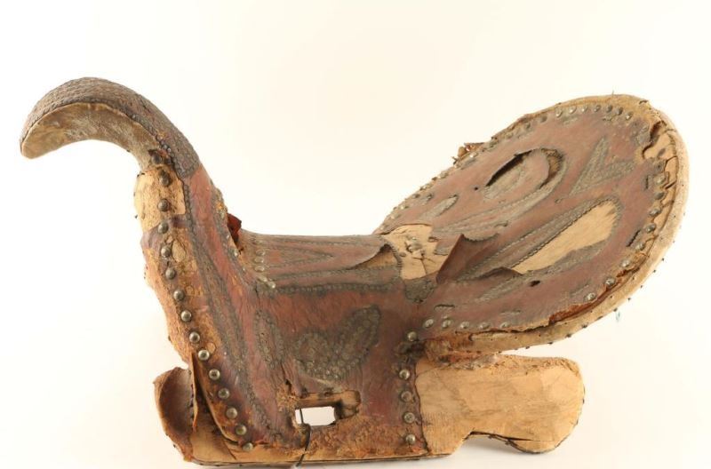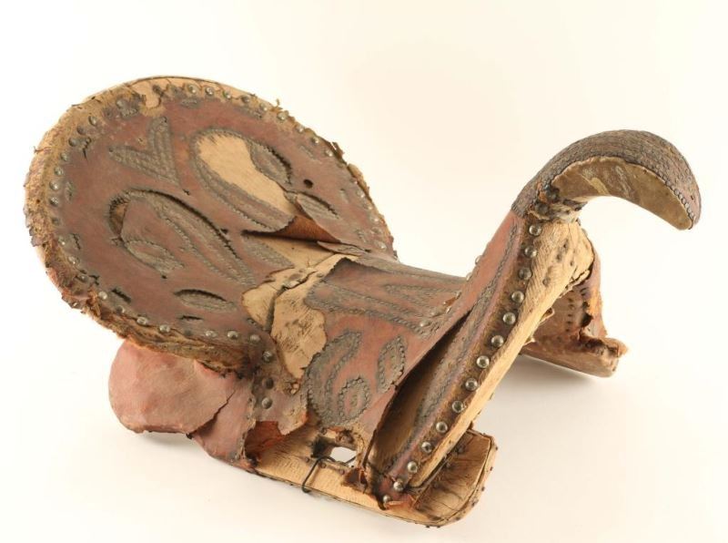 Circa 1830-1860 from the Maxwell collection in Texas. Used in early times to Civil War. Wooden saddle wrapped in leather with nail head accents. Shows major losses and age. Would make a great decorator.