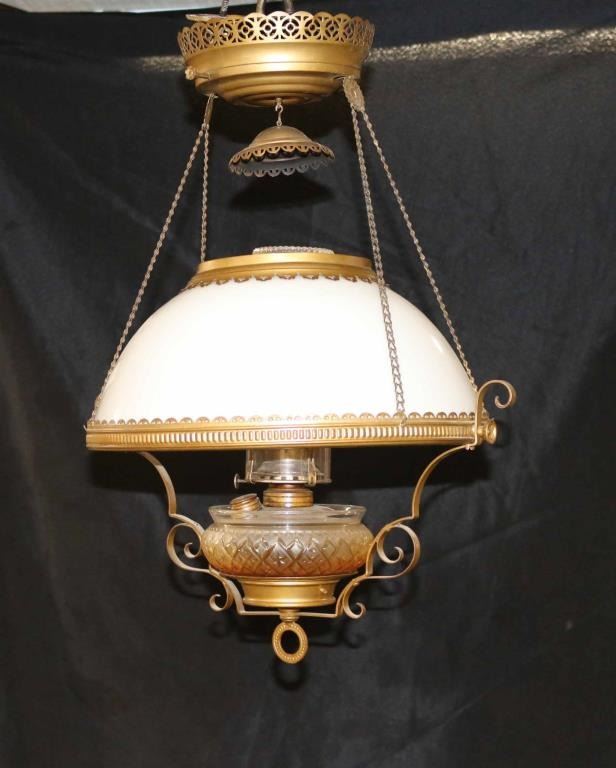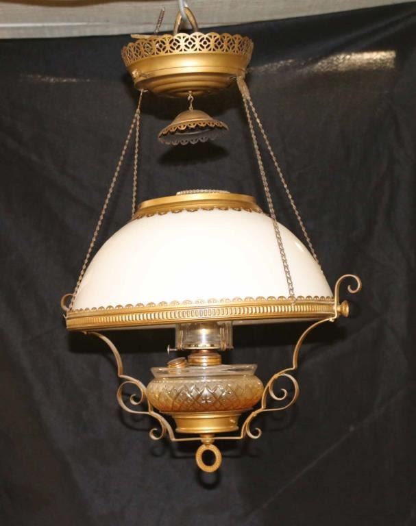 Brass construction kerosene lamp with a milk glass chimney resting atop the suspended oil lamp. Replacement white colored glass dome and includes a hook to hang from ceiling. Measures 21" x 16.5" x 15".