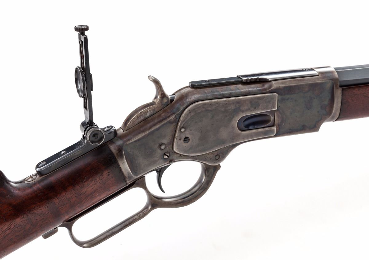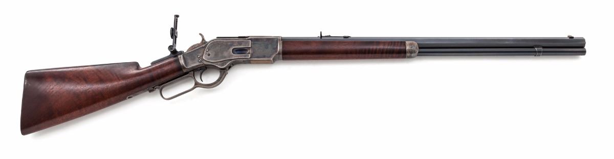 Antique Semi-Deluxe Winchester Model 1873 Lever Action Rifle, #74224, .44-40 cal., 24'' octagonal barrel, blue finish with case hardened frame, smooth straight grip walnut stock with factory high comb and shotgun butt; standard front and rear sights with mid-range vernier tang sight, and factory set trigger. Condition is excellent as restored by Roger Kurtz at Roger's Winchester Restoration, showing light edgewear and appearing very nearly original. Good functioning set trigger, crisp action, very good original bore. Est.: $9,000-$13,000. (Antique)