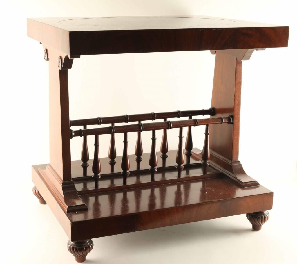 Solid mahogany with lower gallery build in rack for books or magazines, leather oval insert on top. Measures 26" by 26" 20". In good condition.
