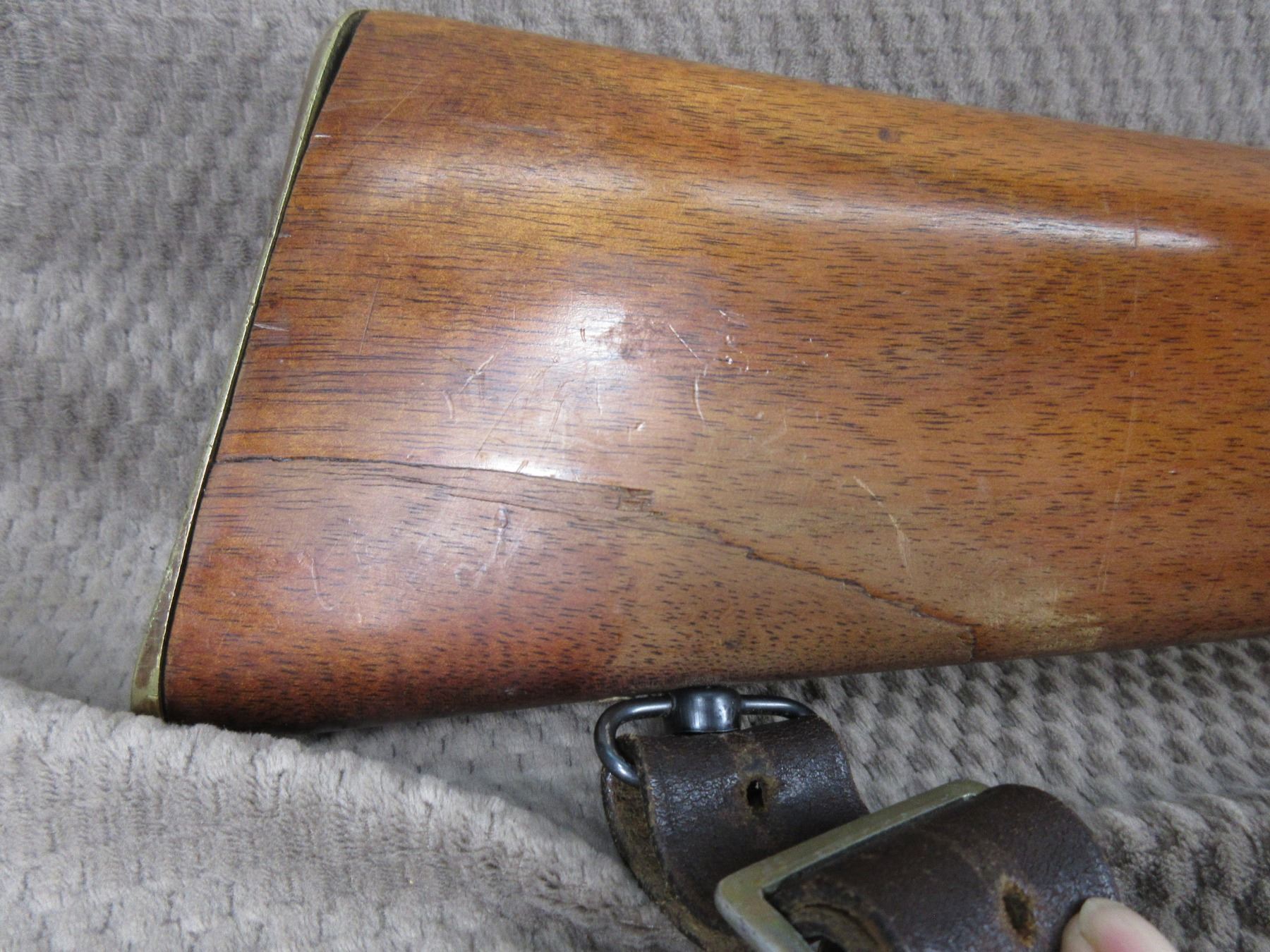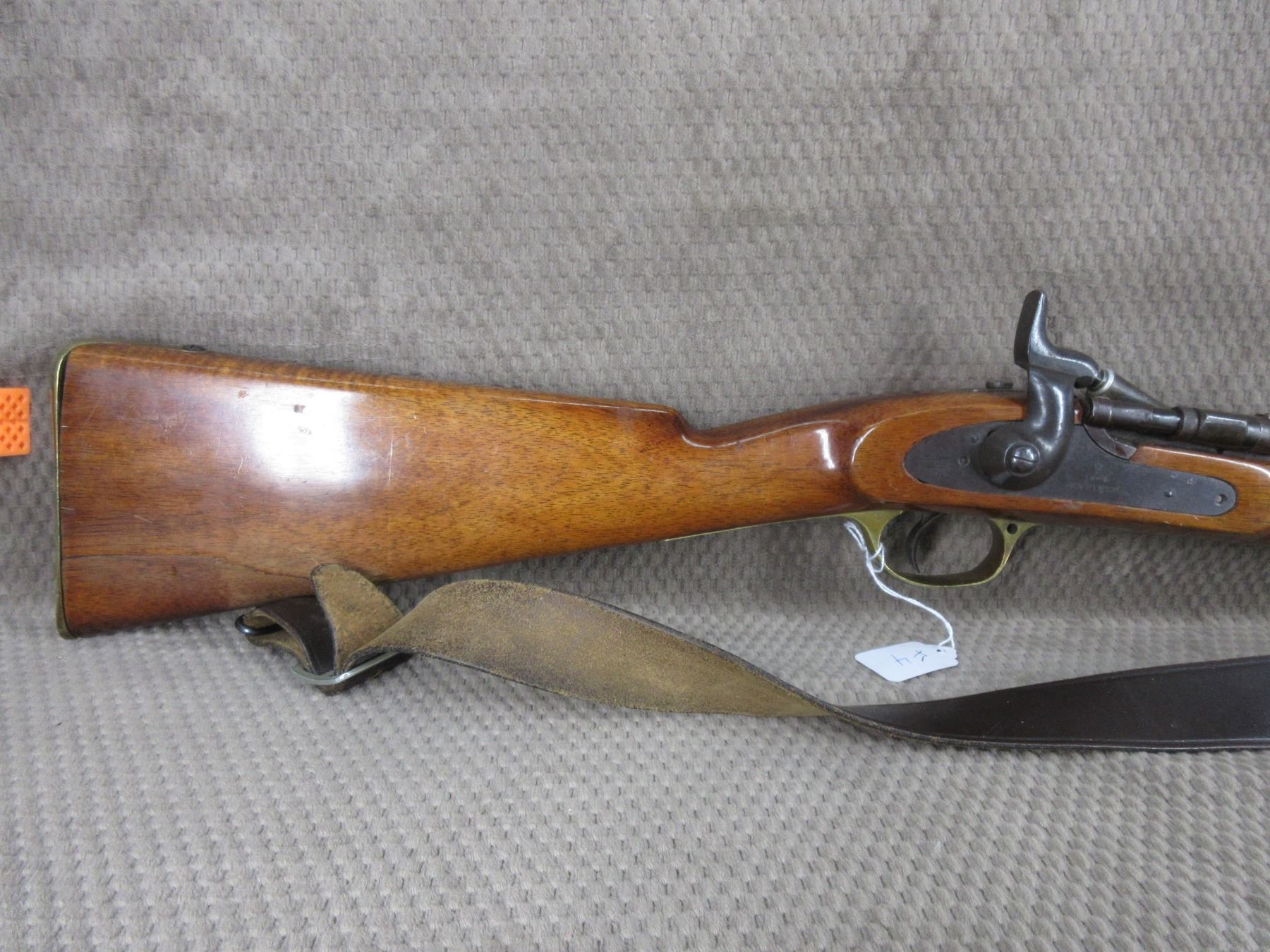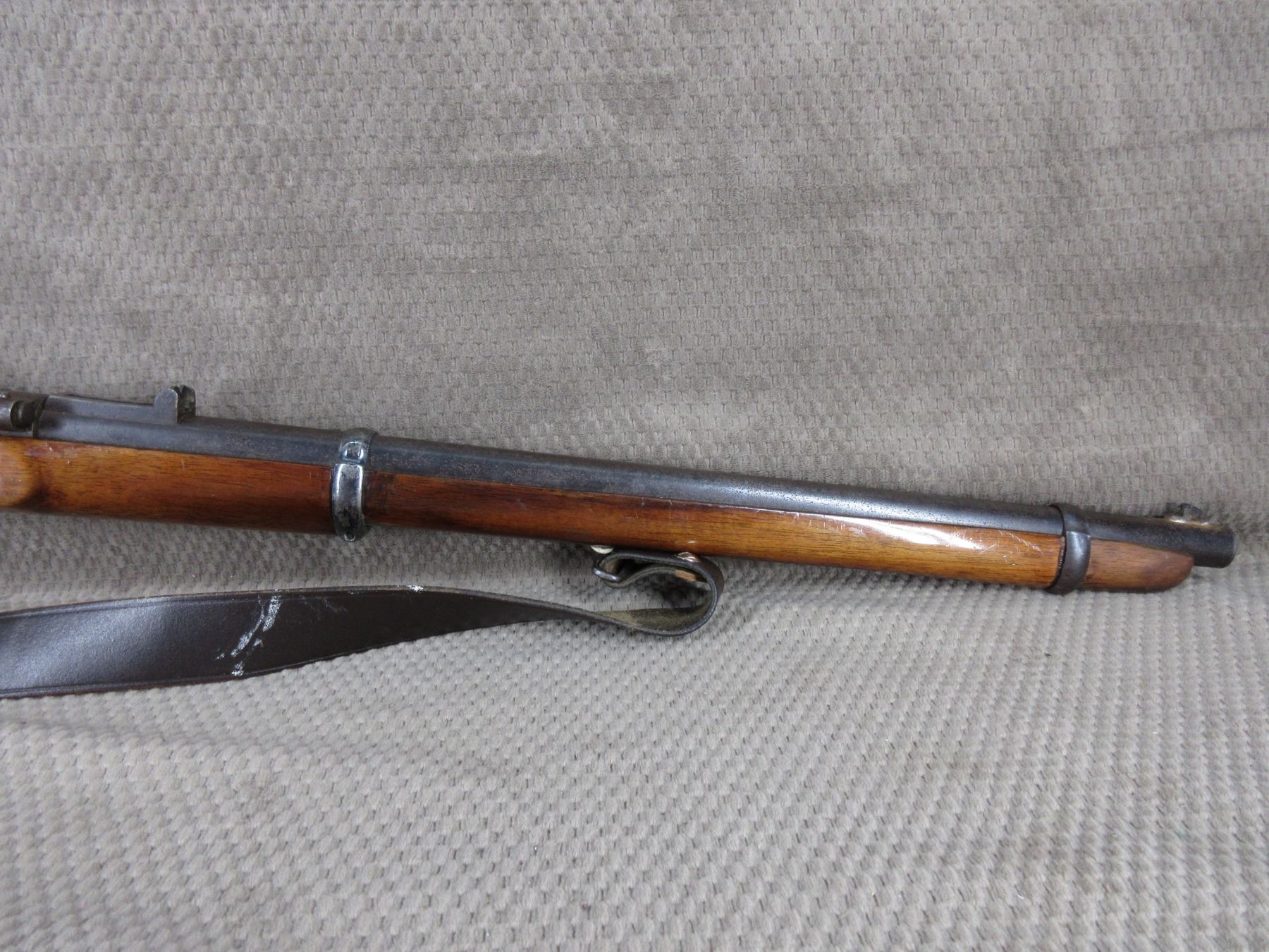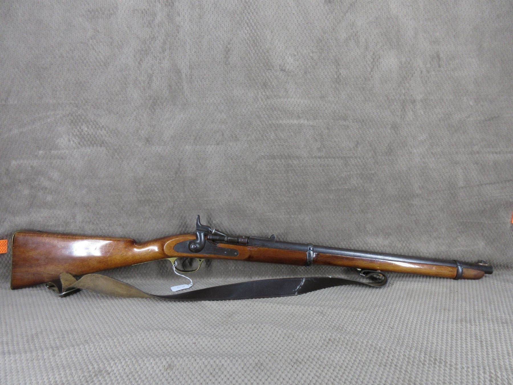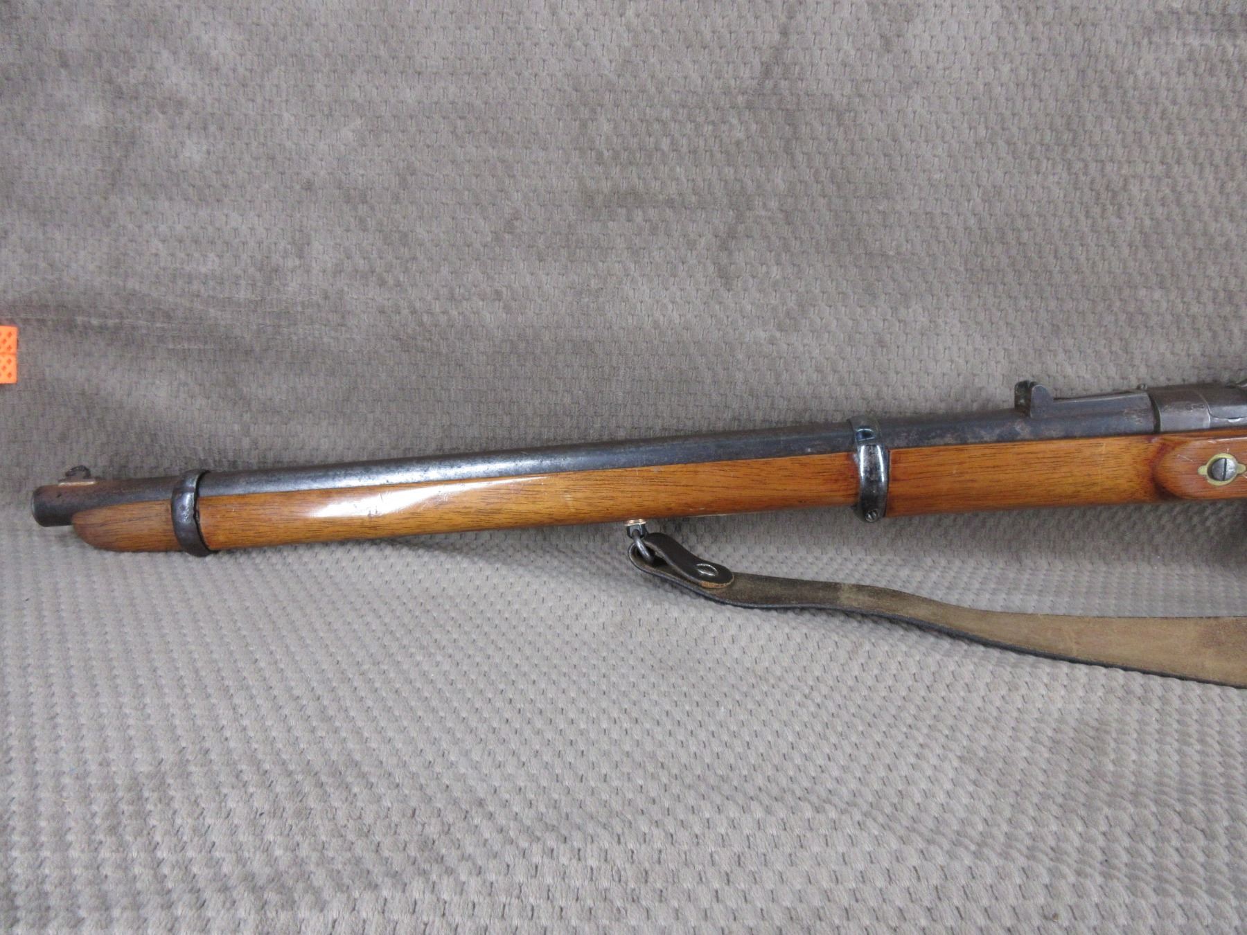 Antique - Snider Enfield 1864 Two Band Rifle in 577 Snider - This side-hinged breechblock rifle was appears to be in good working order. Barrel is 22 1/2", rifling is fair to good as it has black powder pitting, bluing is mostly grey with surface rust on front sight area, has both sights but reat sight has been modified, stock has repair on toe and cleaning rod groove has been filled with wood, brass butt plate.