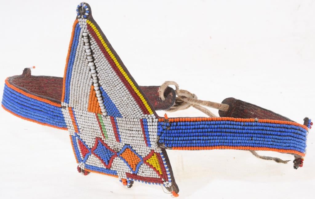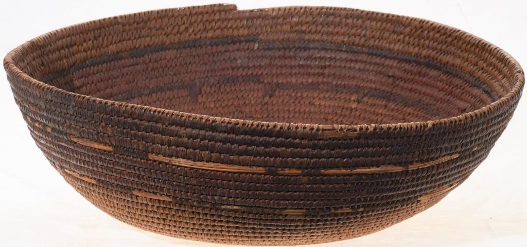 Antique Polychrome tightly woven coil basket. 13” wide by 4.5” deep. Lot also includes Colorful beaded leather belt for traditional costume. The beaded length measures 28” long, the front decoration is 6” tall. Additional length is achieved with a length of leather strap.