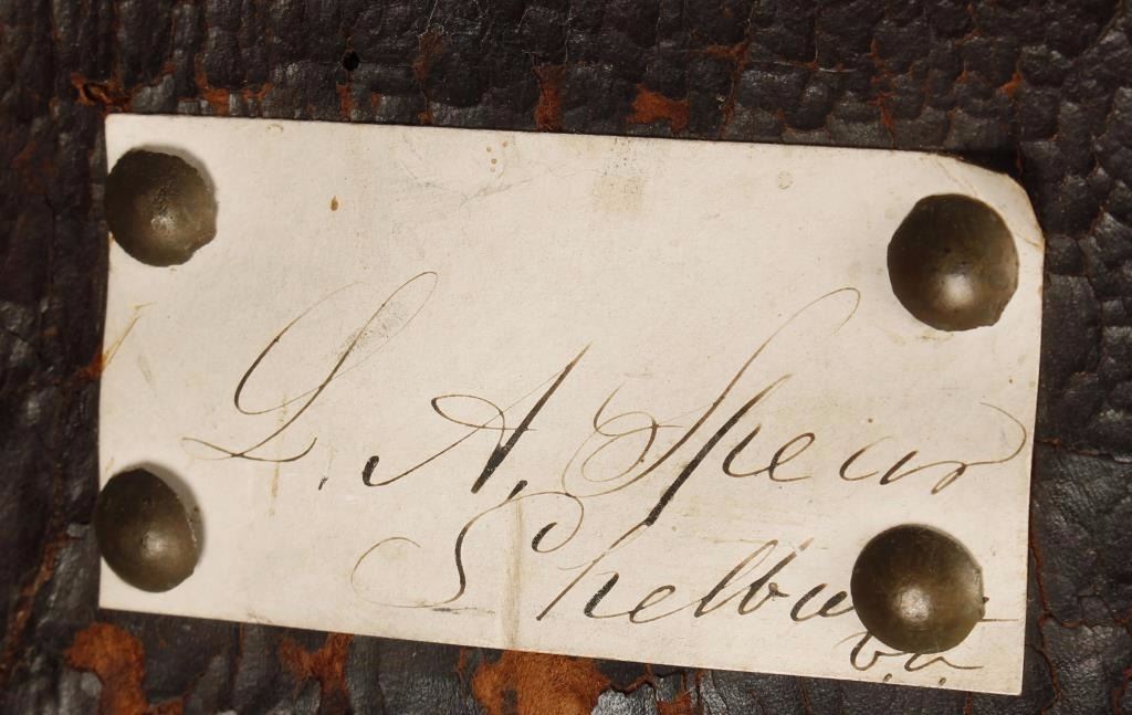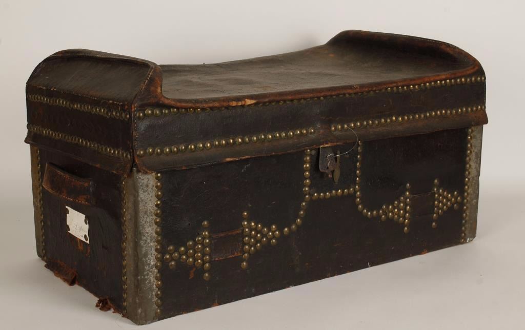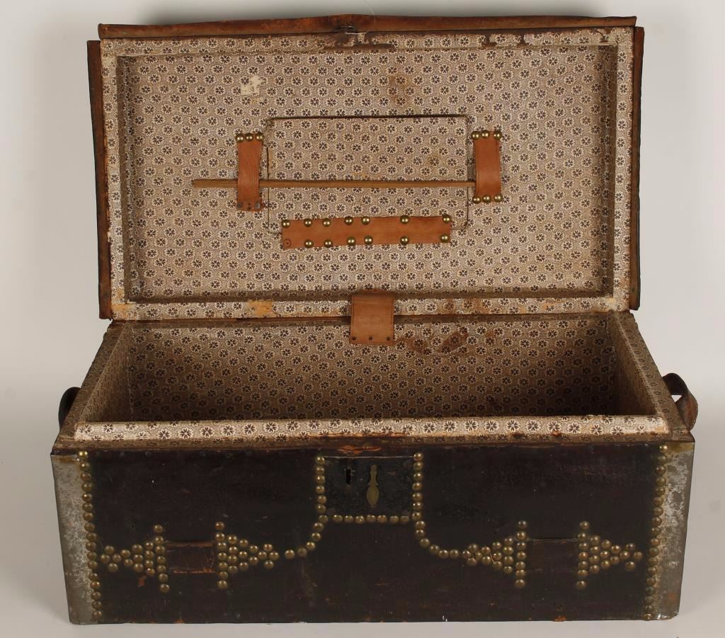 Leather wrapped trunk with tacked design. Includes original paper label 'L.A. Spies'. Measures 24" x 13" x 13" and shows age and patina. In good overall condition.