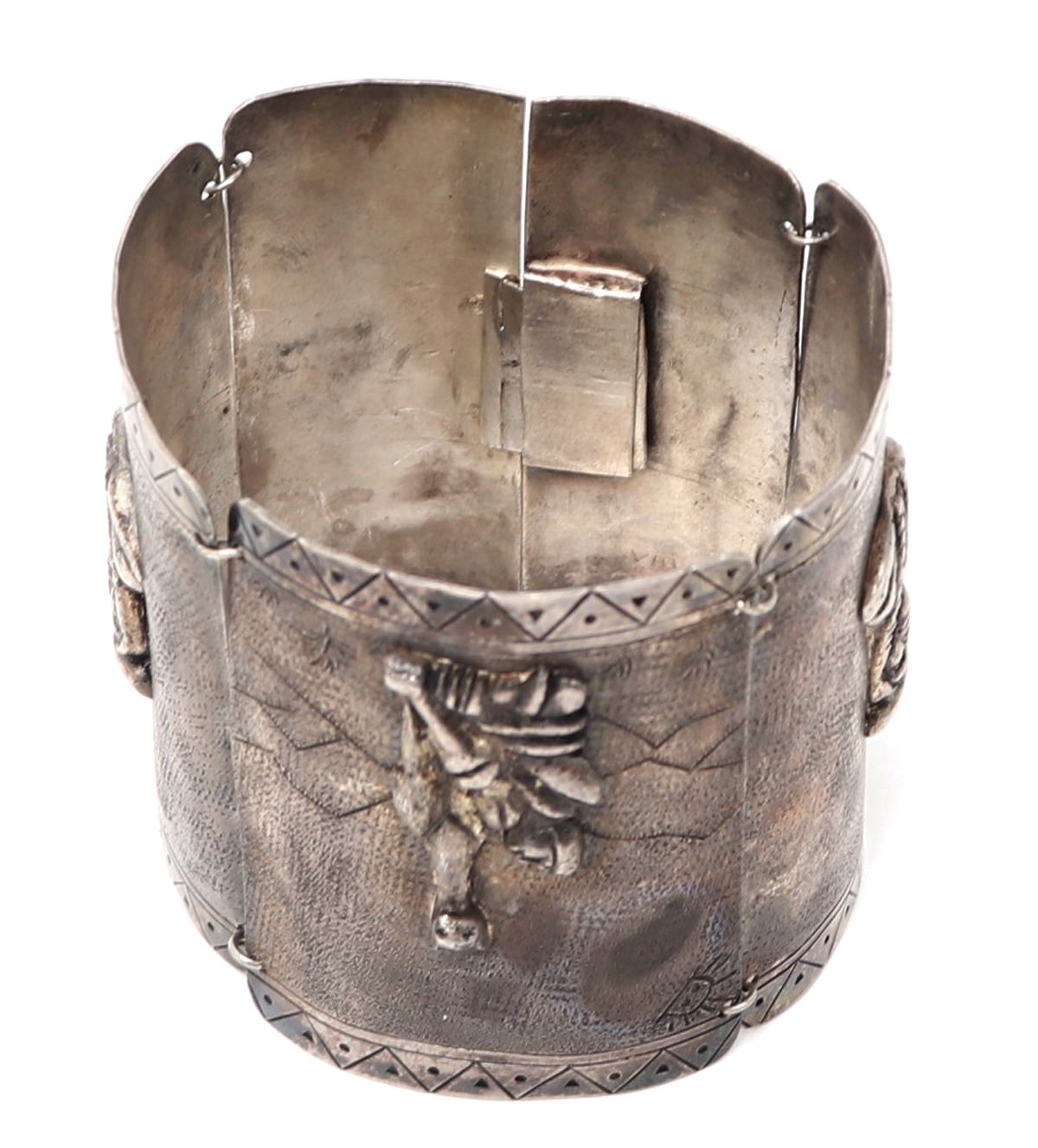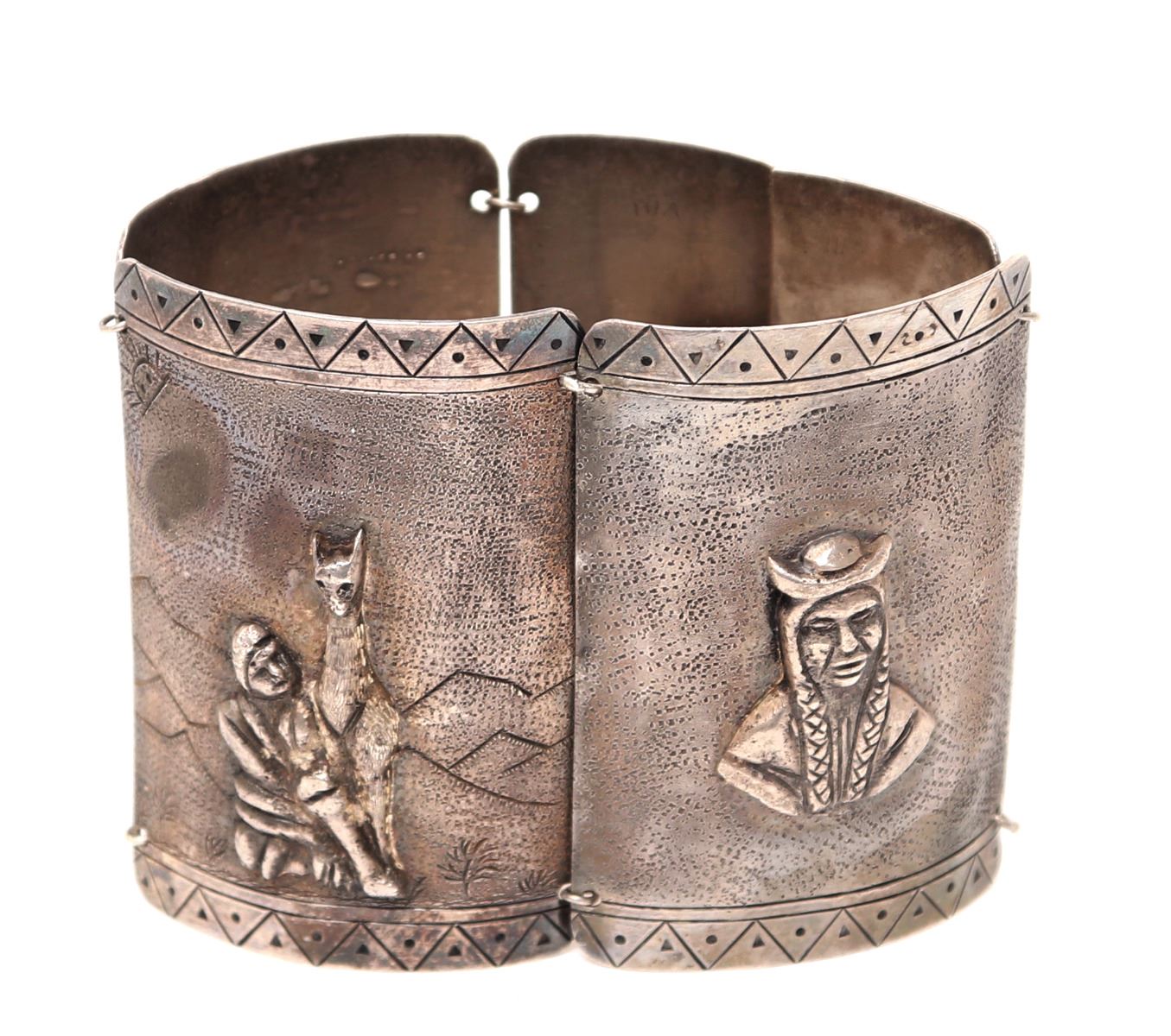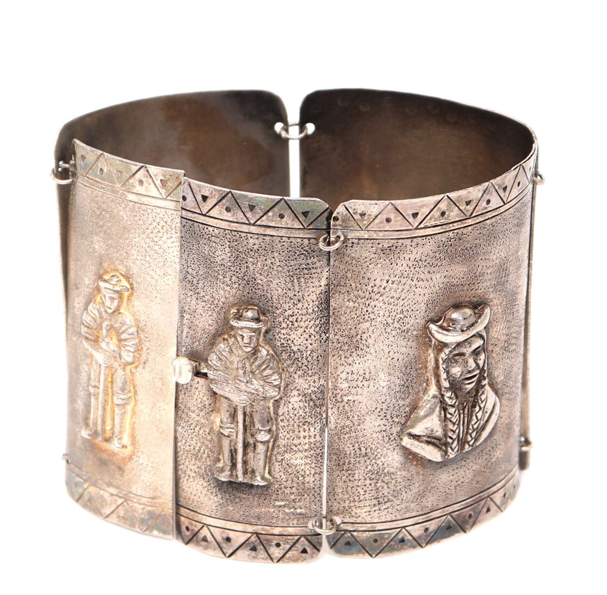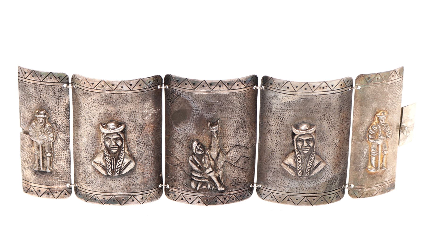 Lovely and well detailed sterling silver storyteller linked panel cuff bracelet. Each panel depicting a man with one panel depicting a man with his alpaca. Marked and hammered 900 to the reverse. Size 2 1/2" W (2 1/8" internally). Condition: Wonderful condition.