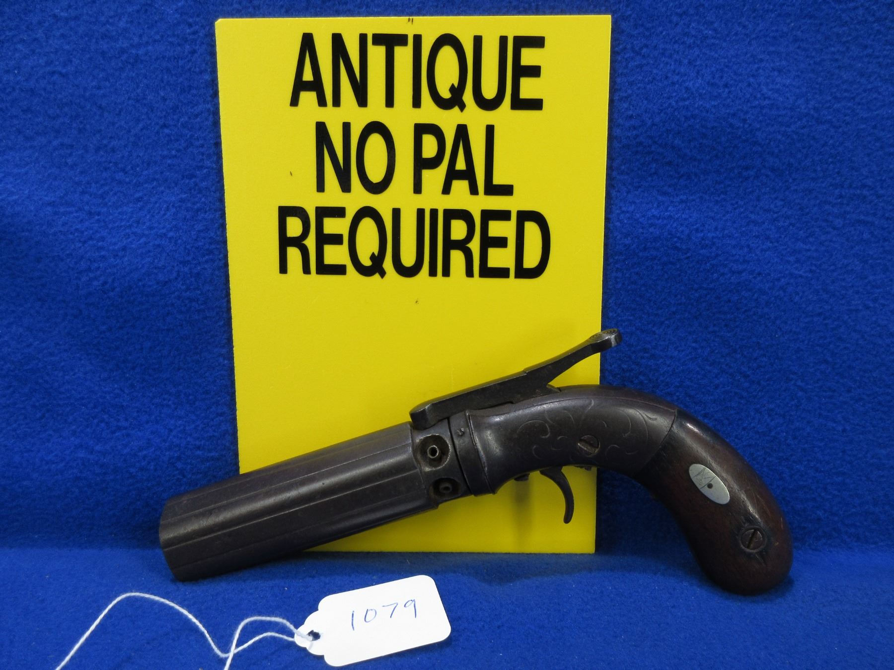 Antique - Unknown Pepperbox in 30 Cal. - This muzzle-loading six-shot pepperbox rotates manually and hammer cocks and fires. Barrels are 3 3/4", bluing is brown, grips are good, 1 nipple is broken off and trigger guard is broken off and missing. Ser # None