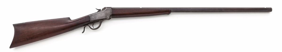 Antique Winchester Low-Wall Single Shot Rifle, #21376, .32-20 cal., 28'' octagonal barrel of No. 1 weight, blue and case hardened finish, walnut stock and forend. Front and rear sights have been removed to facilitate scope. Includes a L.C. Cummins scope with attached rings and light engraving near eyepiece; measures 26-1/8'' in overall length. Mfg'd 1888. Condition is good to very good retaining approx. 60% blue, which has toned brown, with light spots of corrosion and scratches. Case hardened frame has toned a silvery gray. Upper tang screw does not appear to be original. Stock with light scratches and darkening at wrist. Good functioning action, bore is very good. Scope optics remain mostly clear. Est.: $1,000-$1,500. (Antique)