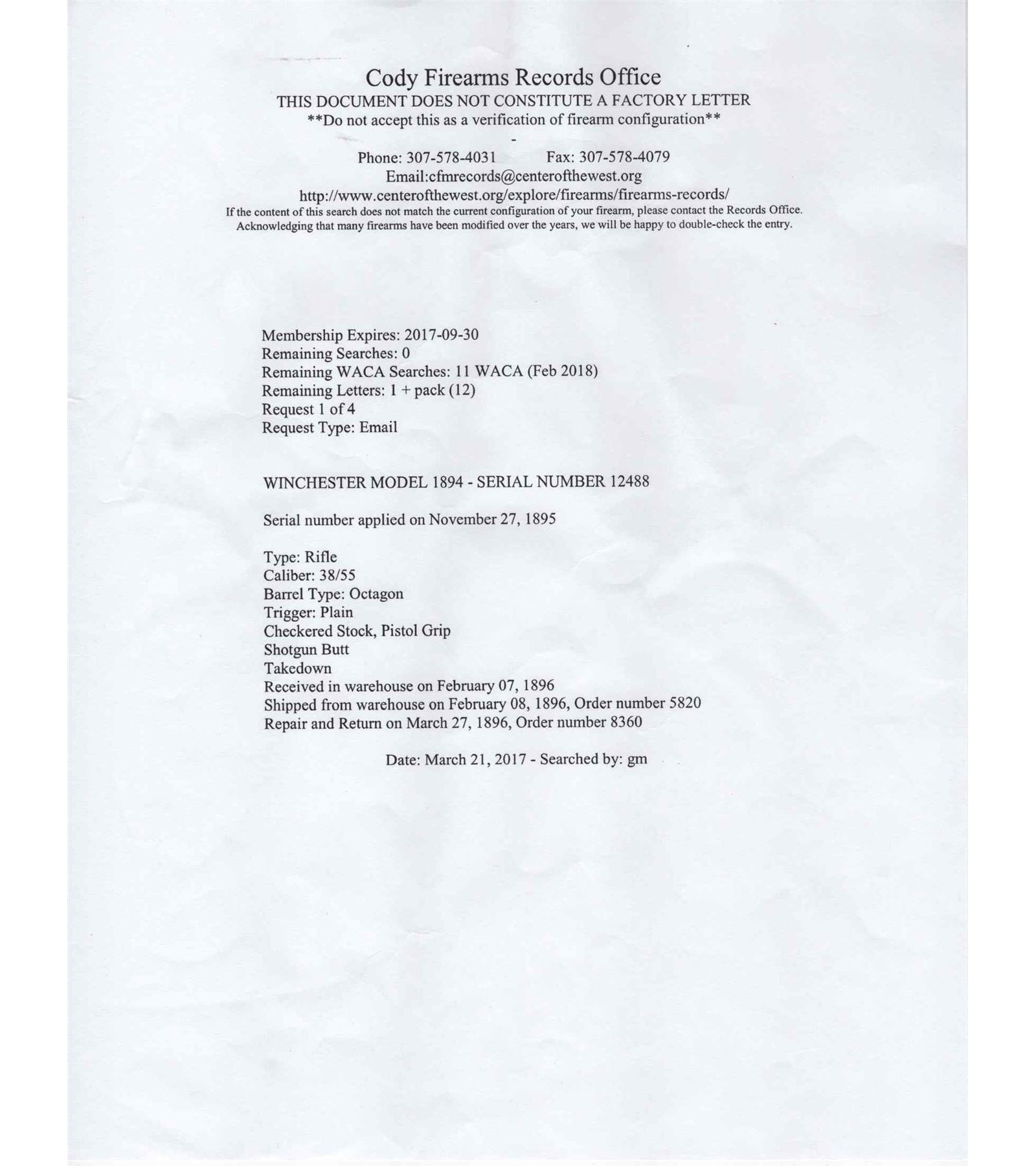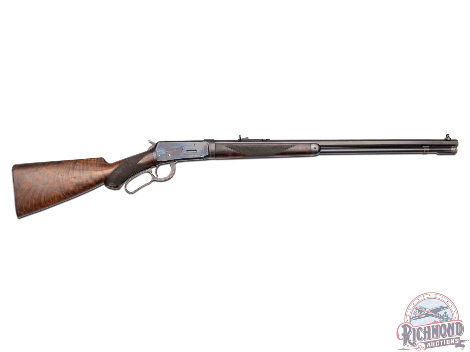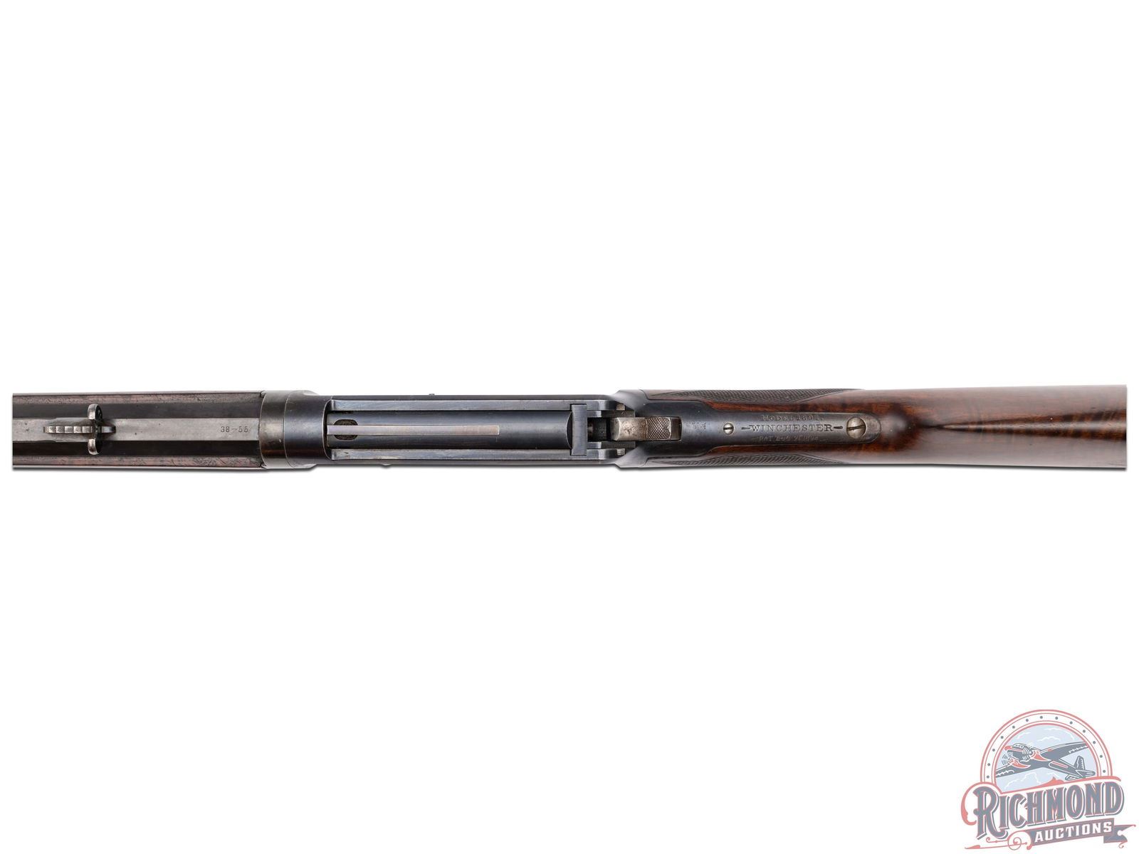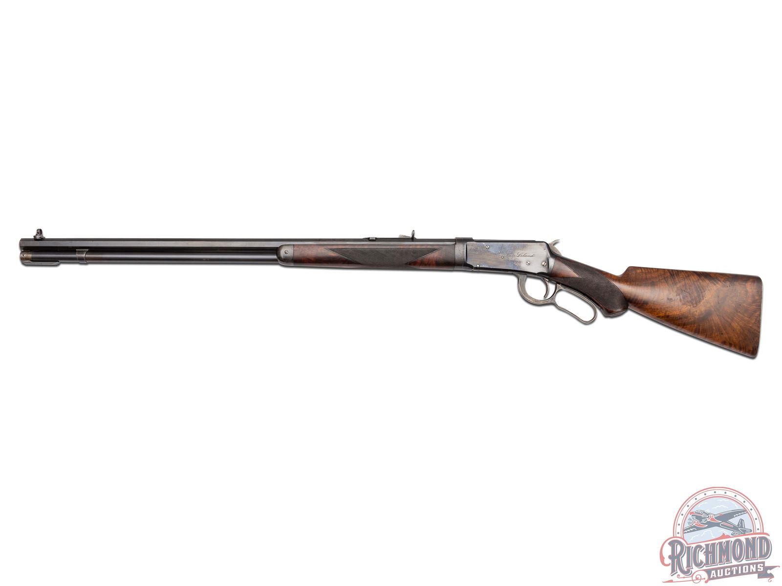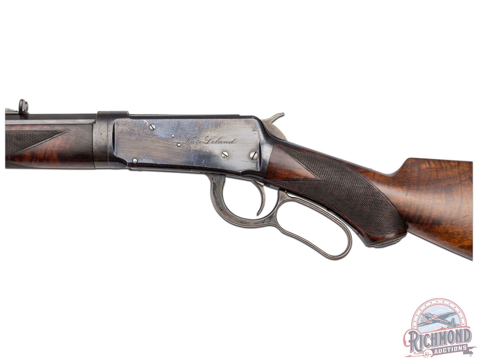 Made by Winchester Repeating Arms Company in 1895 with factory research stating rifle left warehouse in February of 1896 and was returned for repair one month later in 1896. 26" blued octagon Winchester Steel barrel with Beech front sight and No. 22 rear adjustable Lyman sight with two line Winchester barrel address and "38-55" caliber marking. Blued takedown frame with plain trigger and full blued tubular magazine. Case color level and hammer. Action has "Kate Leland" in script on left side. Select walnut checkered pistol grip stock with smooth steel shotgun butt plate with Winchester hard rubber grip cap. Matching Deluxe checkered forearm with blued nose cap. Comes with Cody Research. CALIBER: 38-55. S/N: 12488. FFL STATUS: Antique.