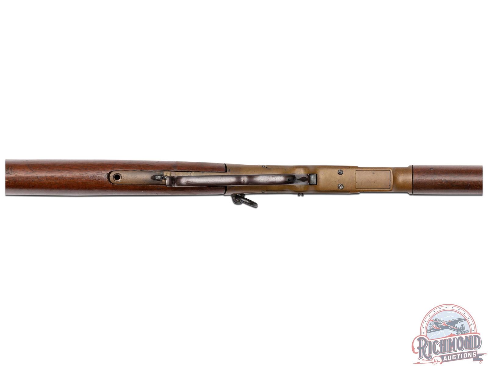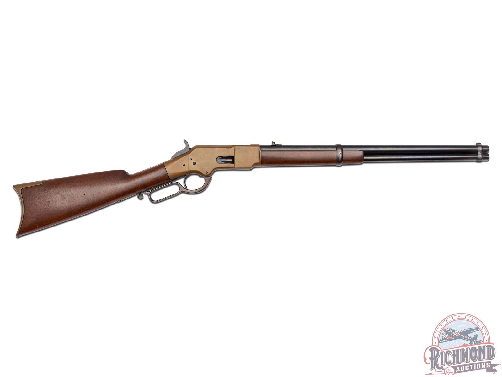 Made by Winchester Repeating Arms Company in 1868. Gun is a Second Model and is fitted with a 20" round blued barrel with integral blade band front sight and correct rear two position flip sight. Barrel has remnants of Henry and King's Patent markings. Gun Metal brass Second Model frame with blued saddle ring, lever, hammer and loading gate. Carbine still retains original rimfire bolt. Carbine was serial numbered on left lower tang, but due to a repair it is not visible. Second Model stock with illegible serial number in top tang channel. Butt stock is marked "15871" on butt in ink with brass trap butt plate stamped "15871". Walnut forearm with blued barrel band and full blued tubular magazine. CALIBER: 44 Henry. S/N: 15871. FFL STATUS: Antique.