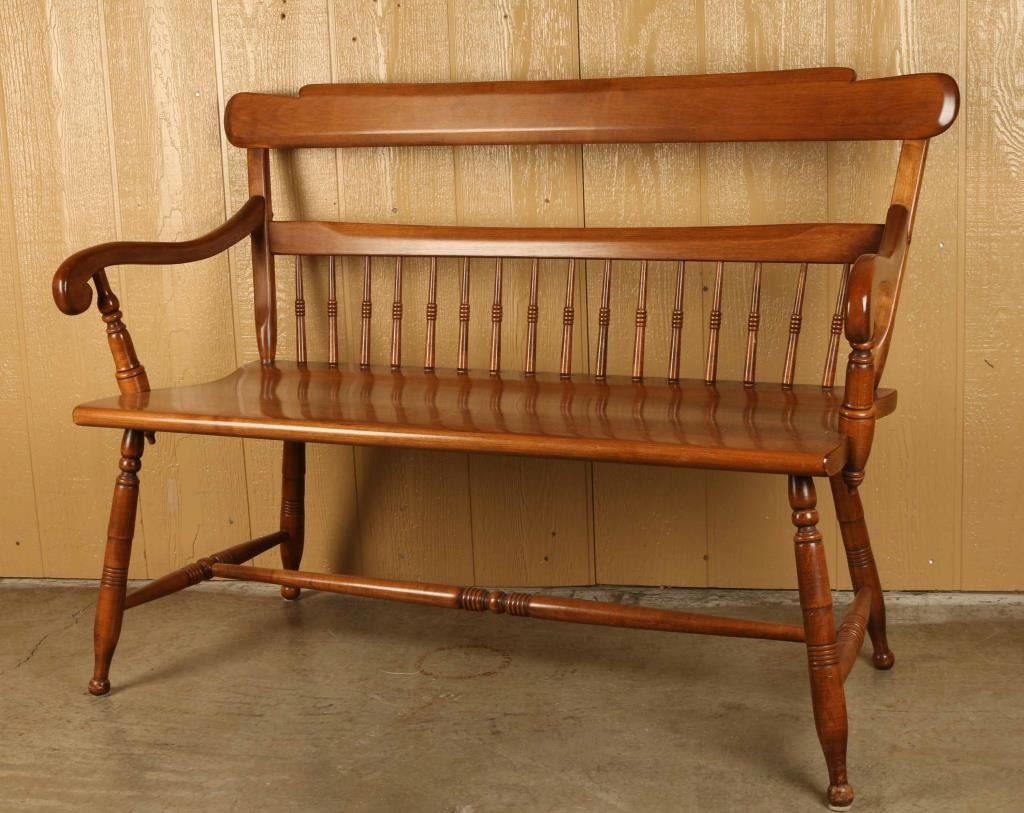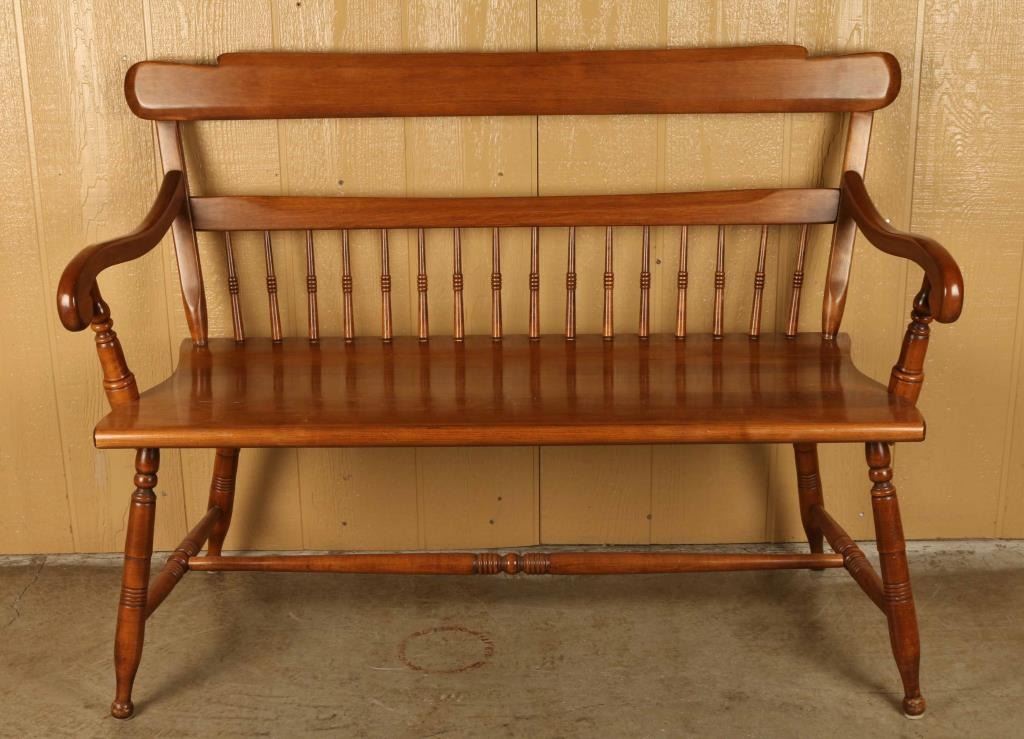Solid wood with spindle legs and back. Measures 34" by 46" by 21". In very good condition.