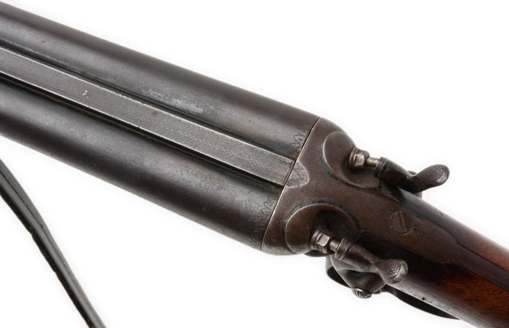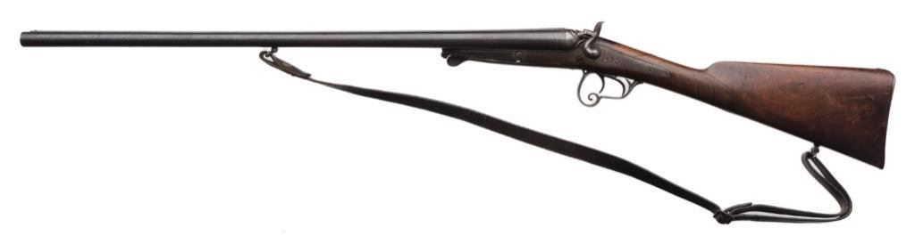 Antique shotgun marked “Dalmieu”, ca 1870’s to 1880’s, 16 gauge, 27.5” barrels, checkered wood butt stock, leather sling in overall fair to good condition showing a dark patina to metal surfaces, fair to good bore, good actions, worn wood butt stock with old crack at wrist. Est.: $150-$300.
