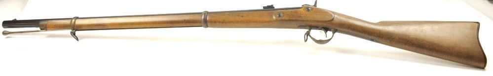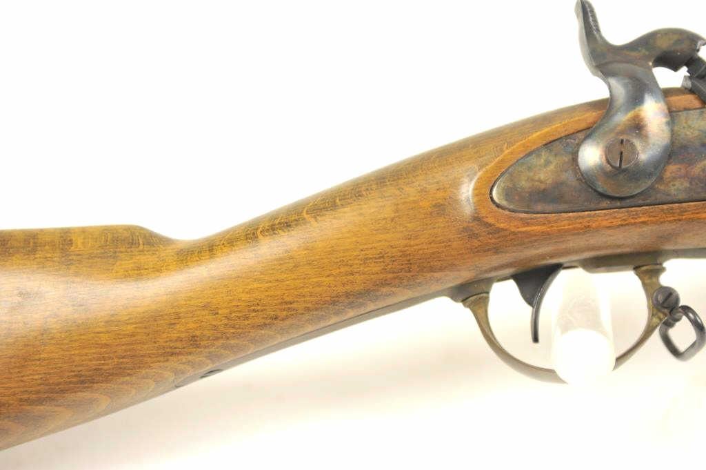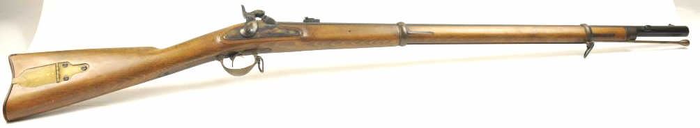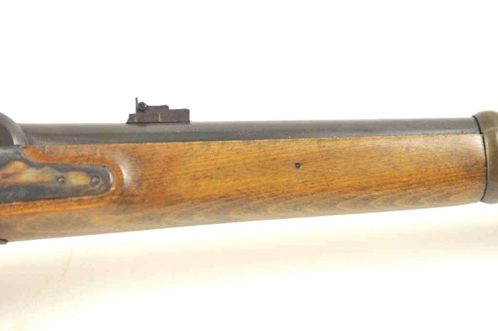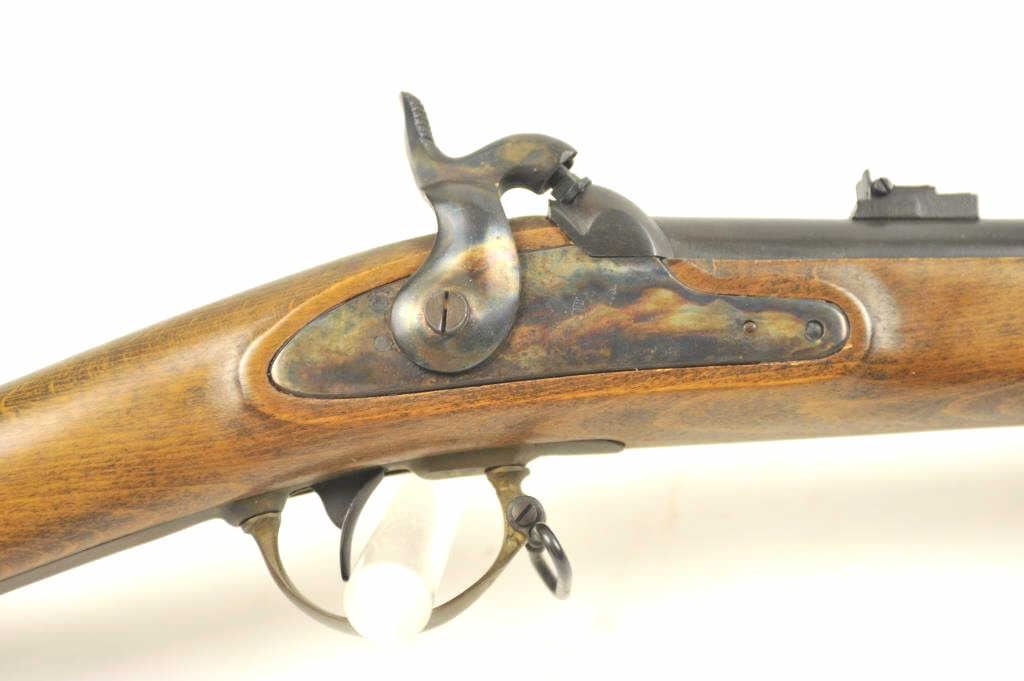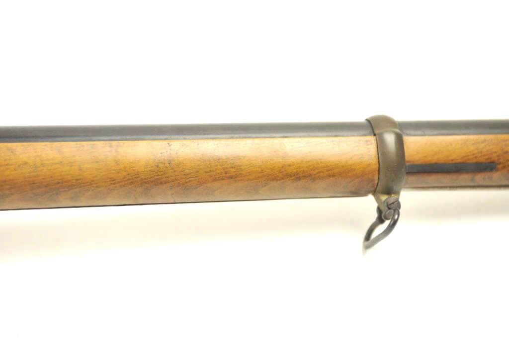 Antonio Zoli Reproduction Zouave percussion rifle, .58 caliber, Serial #13921. The rifle is in nearly excellent overall condition with a 32” barrel, brass barrel bands and a brass ramrod. The side plate is case colored and the hardware is brass. The smooth wood stock is in very good condition with a brass patch box on the right side of the butt stock and a smooth crescent brass butt plate. Est.: $150-$300.
