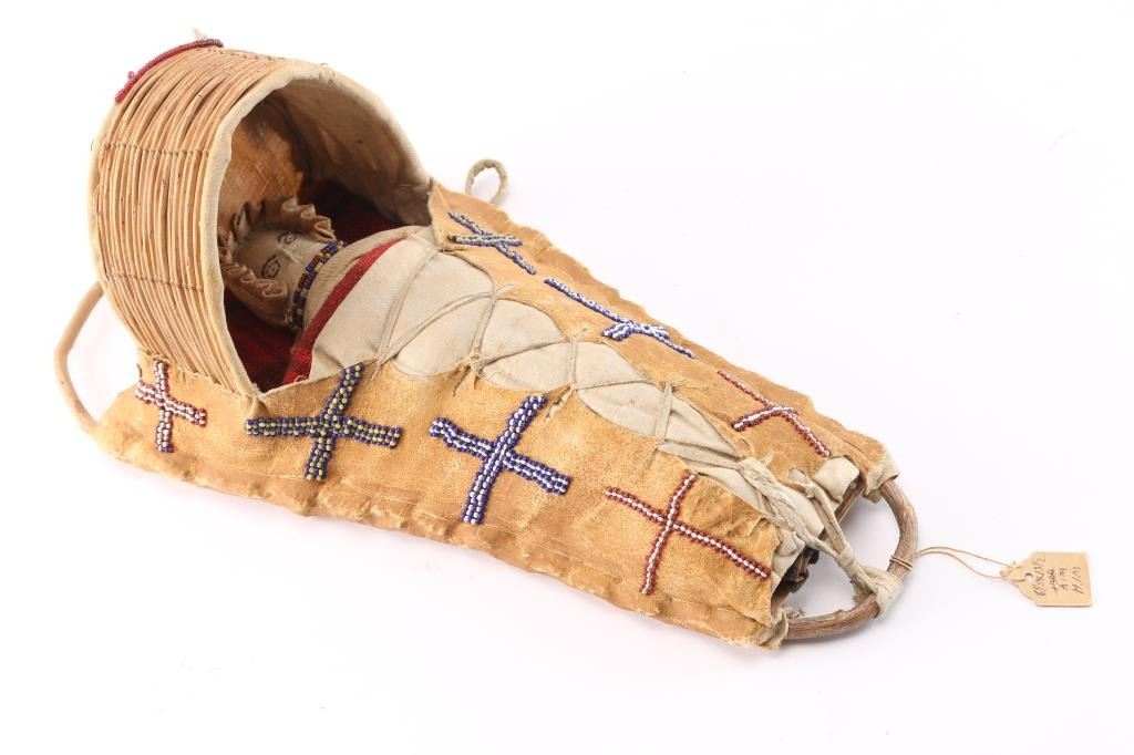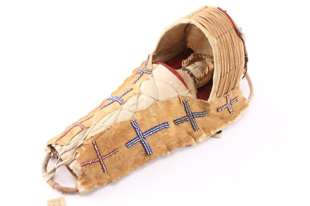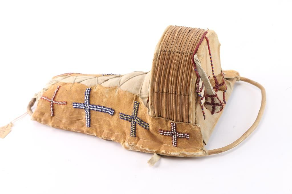 Leather wrapped and beaded cradle board which has hanging beaded mini purses included is an leather indian doll. Measures 14"x6" Includes old tag reads"Apache Gila River AZ" show's age beautifully made.