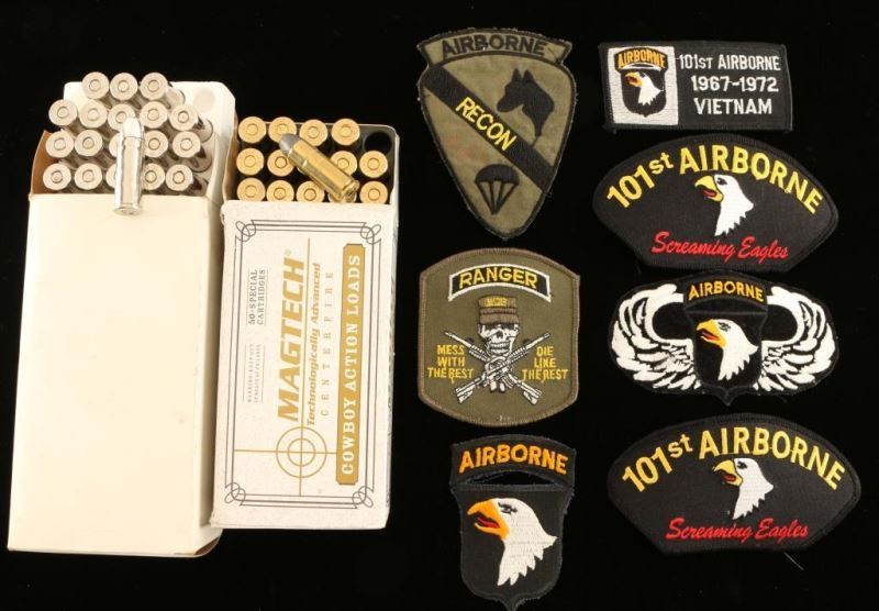Includes 1 box Magtech 250 Gr lead flatnose, 50 Rds unmarked, 6 display cartridges and 7 military patches.