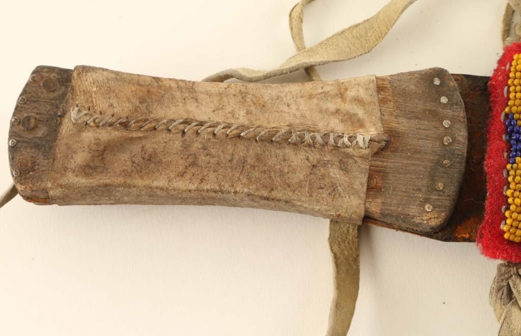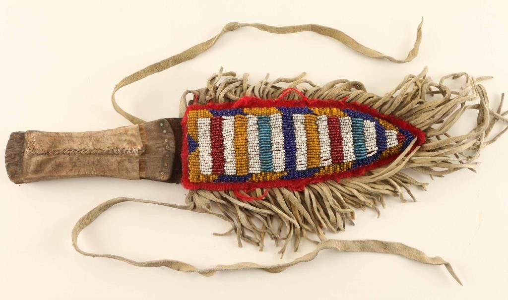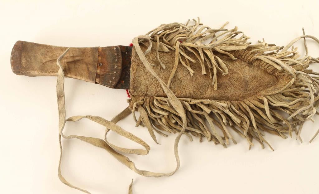 Leather With Fringe With Coffin Handled Knife That Has A Leather Wrapped Handle. 13"overall.