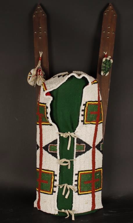 Tipi and geometric design in white, orange, black and yellow. Cradle board is accented with turtle effigy and baby moccasins. In overall good condition.
