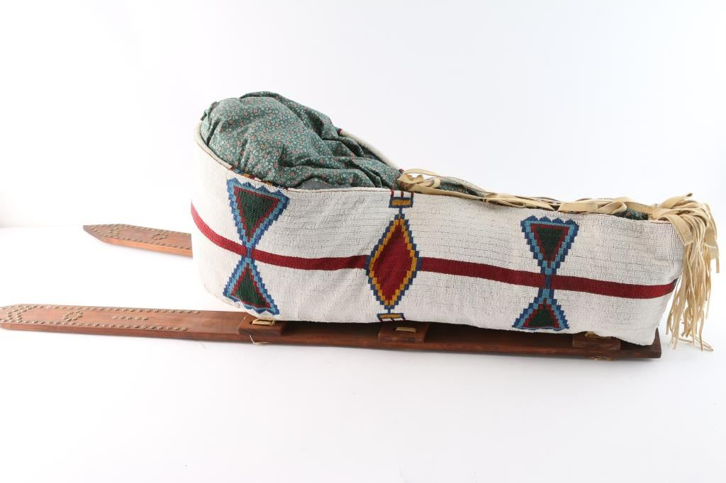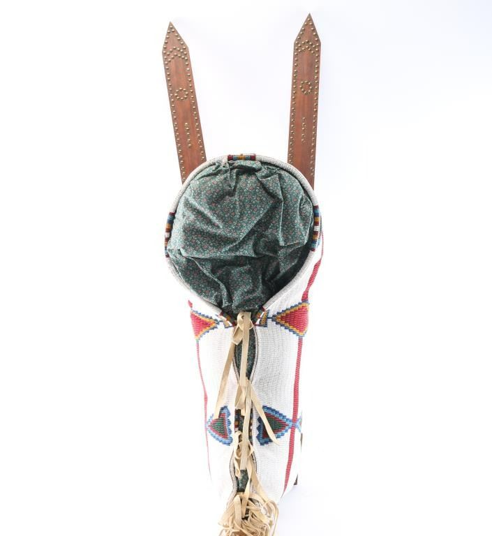 With geometric beaded design (white base with red, blue and yellow beads. Wooden board has brass tacks. Overall good condition. Measures: 42"H x 14"W x 12"D.