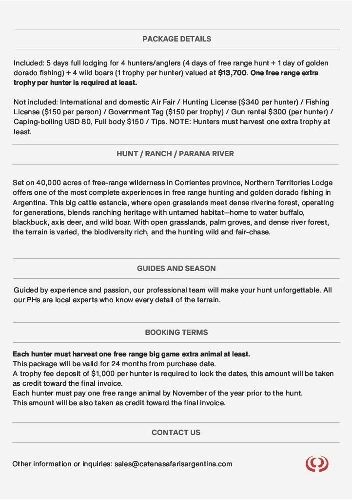 Enjoy an unforgettable 5-day free-range hunting and fishing adventure in Argentina for two hunters/anglers with Catena Safaris.