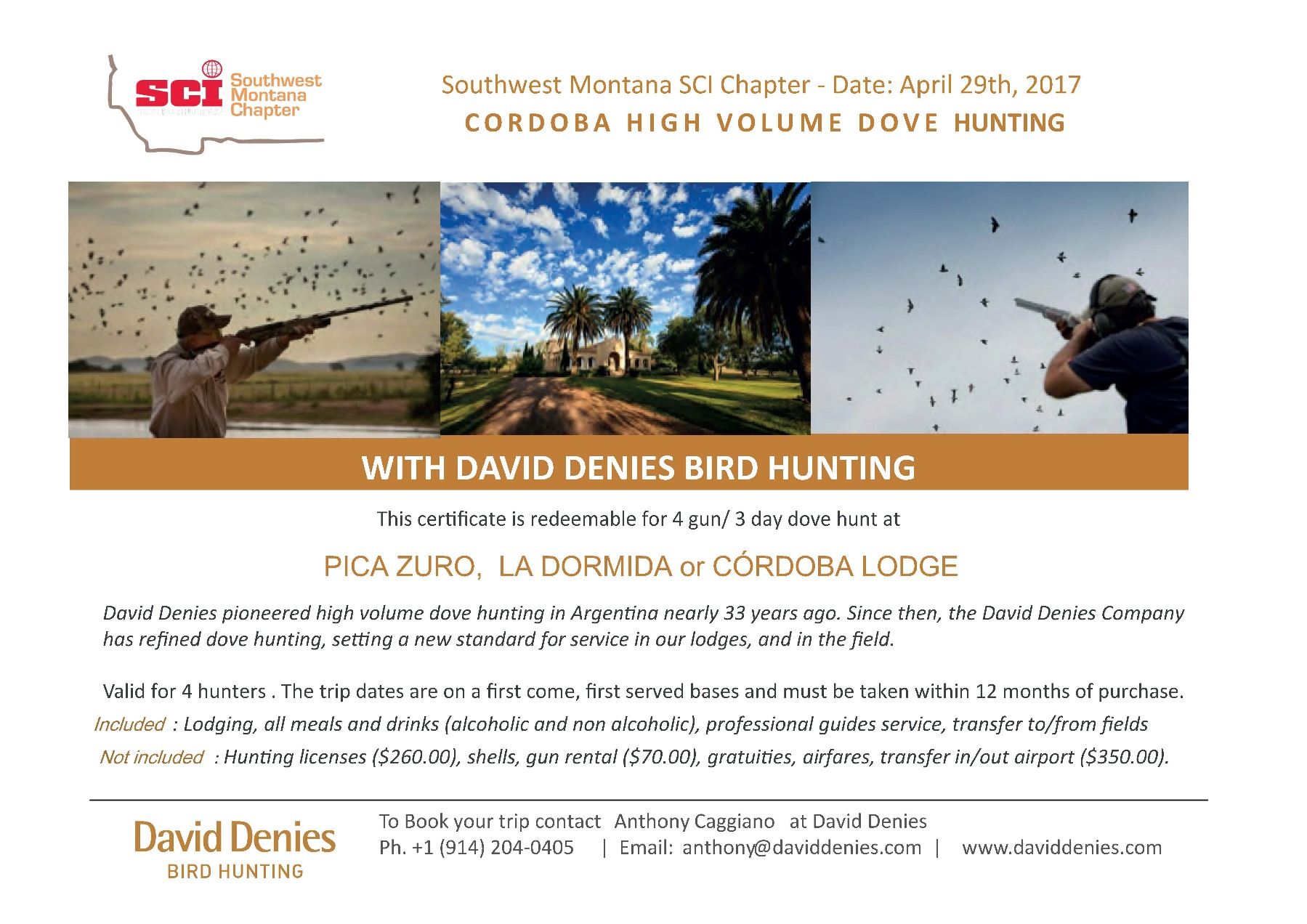 Included in donation: 3 nights lodging, 3 days of hunting (2 half days & 2