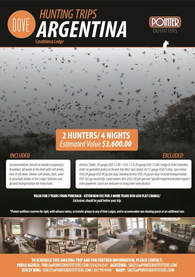 This is a bucket list incredible hunt experience for two hunters for four nights accommodations. You will be treated like royalty in every way. In the field, you will experience lavish asado (meat) lunches with a siesta in a hammock afterwards if you choose. The shooting is unlimited with some guests shooting 8000 times. Your field assistant will keep your gun loaded and do all fieldwork for each hunter. At Casa Blanca, you will have a private and cozy experience in this well-appointed lodge. You will be fed a full breakfast and amazing dinners. You even have a butler to handle every need. Argentina's culture is a wonderful experience. It is a perfect travel hunting destination.