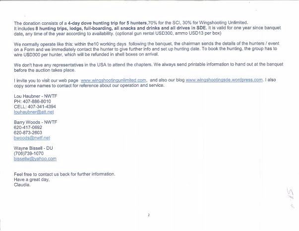 Anyone interested in bidding on the hunts or fishing trips is advised to see Glenn Rasmussen or Rebecca Simmons and read the information that has been received so that you may be sure of what you are bidding on and that there will be no misunderstandings.