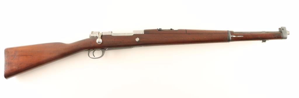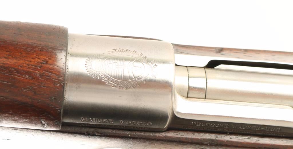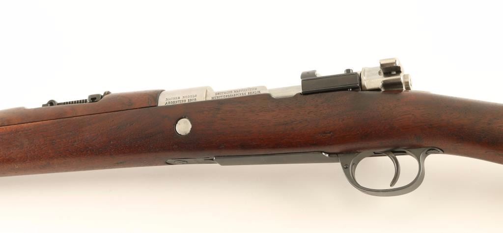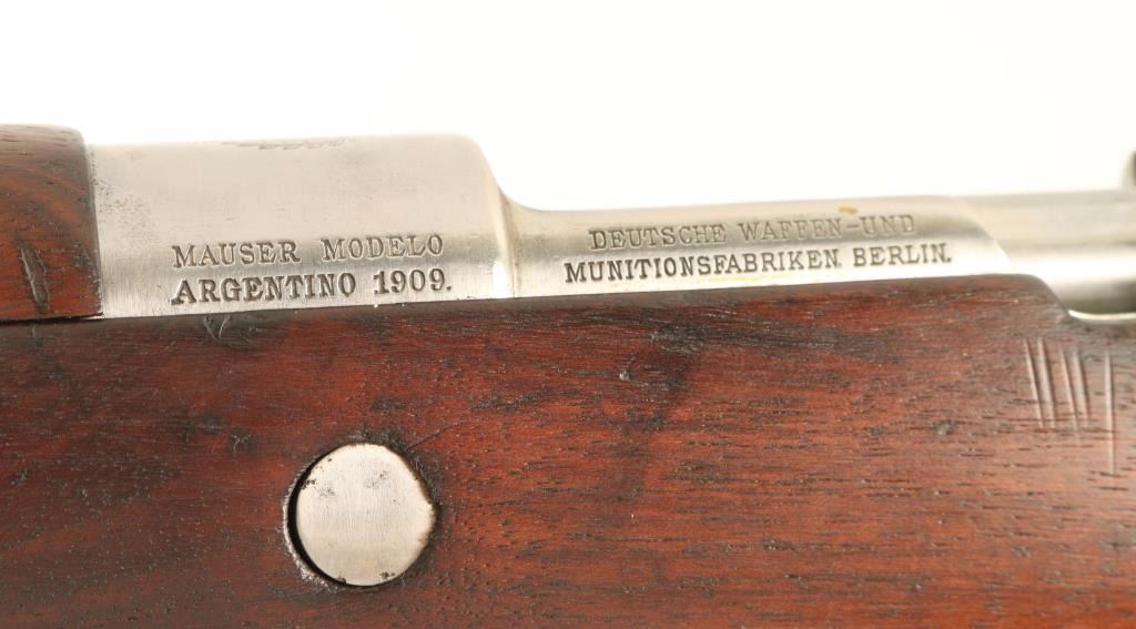 SN: B7553 Argentine military bolt-action service rifle chambered in 7.65x53mm, built in Berlin by DWM circa 1910-1911. Imported by JLD Enterprises of Farmington, CT with small import marks on the receiver. Features a blued 22" barrel, shrouded & dovetailed inverted 'v' front sight, tangent rear sight graduated to 1,400 meters, bayonet lug, bent bolt handle, manual safety on bolt, internal box magazine with hinged floorplate, smooth trigger, sling swivels, smooth wood handguard and full-length straight grip shoulder stock with smooth metal buttplate. Serial numbers match on the receiver, bolt handle and bottom metal. Rifle exhibits approximately 96% of it's finish intact overall showing little wear while the receiver, bolt and buttplate are in-the-white. The receiver shows light evidence of old pitting which has been cleaned. Action is smooth, bore is dull with good rifling and wood stocks are fine. Condition is near excellent. ***C&R Firearm*** ***Modern Firearm***