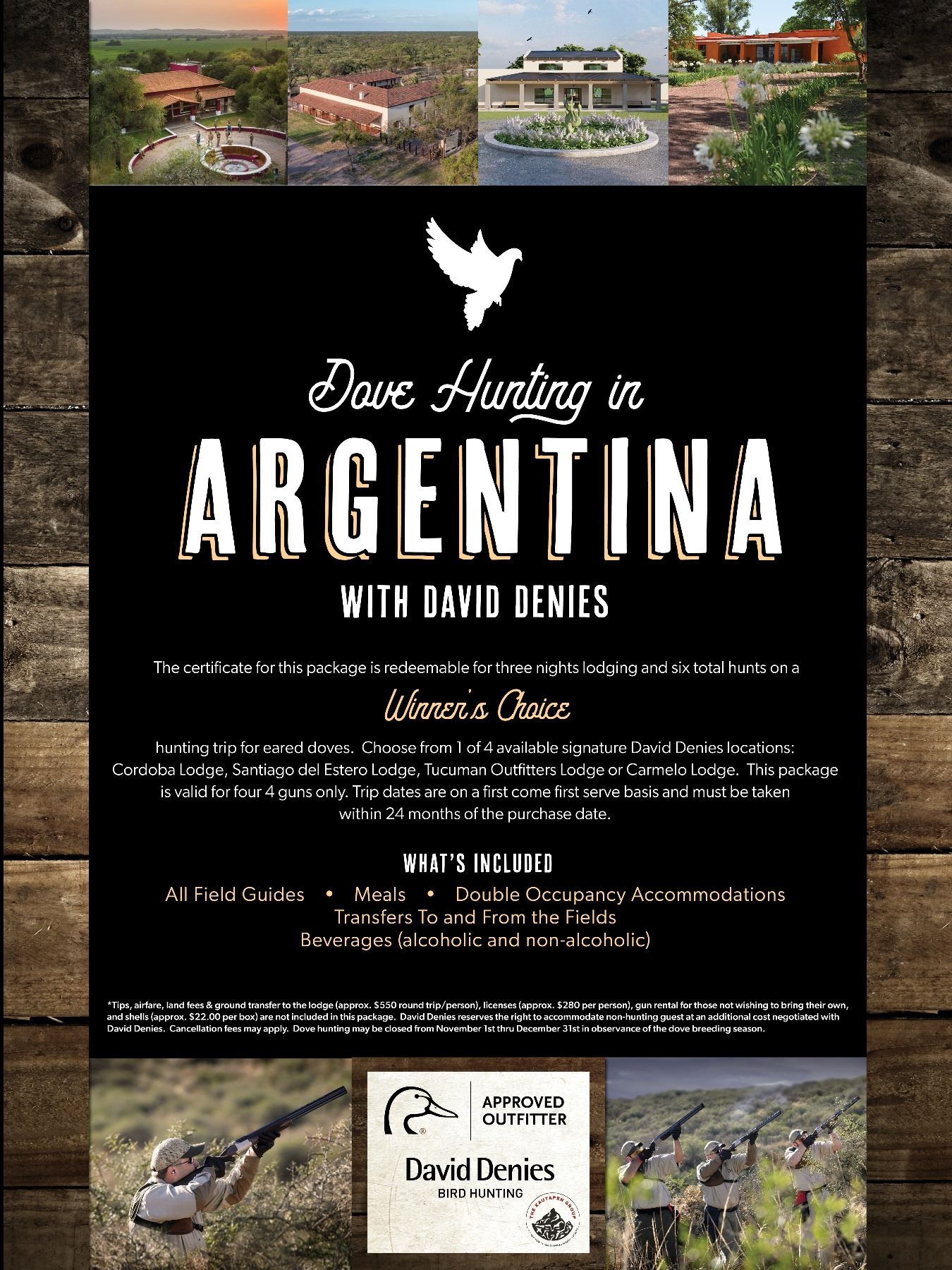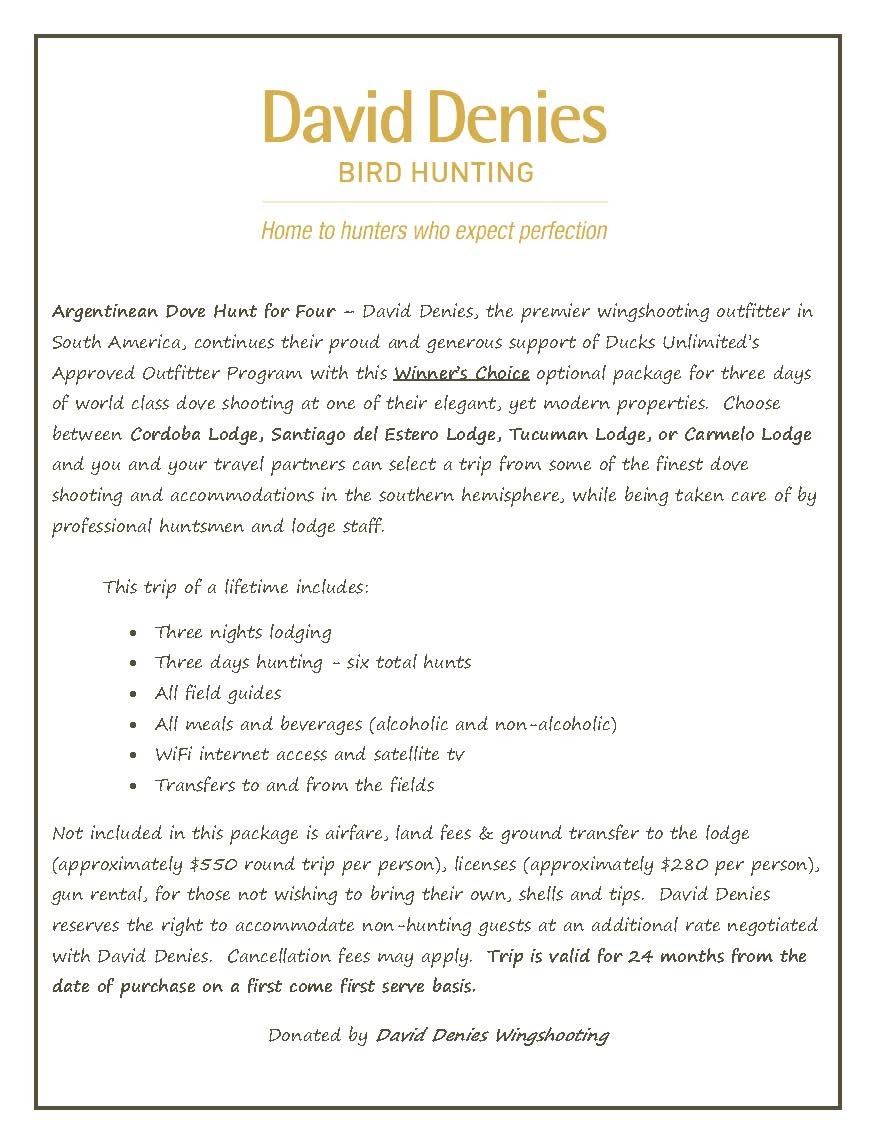 David Denies, the premier wingshooting outfitter in South America, continues their proud and generous support of Ducks Unlimited’s Approved Outfitter Program with this Winner’s Choice optional package for three days of world class dove shooting at one of their elegant, yet modern properties. Choose between Cordoba Lodge, Santiago del Estero Lodge, Tucuman Lodge, or Carmelo Lodge and you and your travel partners can select a trip from some of the finest dove shooting and accommodations in the southern hemisphere, while being taken care of by professional huntsmen and lodge staff. This trip of a lifetime includes: Three nights lodging. Three days hunting - six total hunts. All field guides, All meals and beverages (alcoholic and non-alcoholic). WiFi internet access and satellite tv. Transfers to and from the fields. Not included in this package is airfare, land fees & ground transfer to the lodge (approximately $550 round trip per person), licenses (approximately $280 per person), gun rental, for those not wishing to bring their own, shells and tips. David Denies reserves the right to accommodate non-hunting guests at an additional rate negotiated with David Denies. Cancellation fees may apply. Trip is valid for 24 months from the date of purchase on a first come first serve basis.