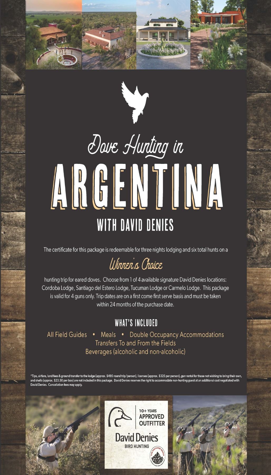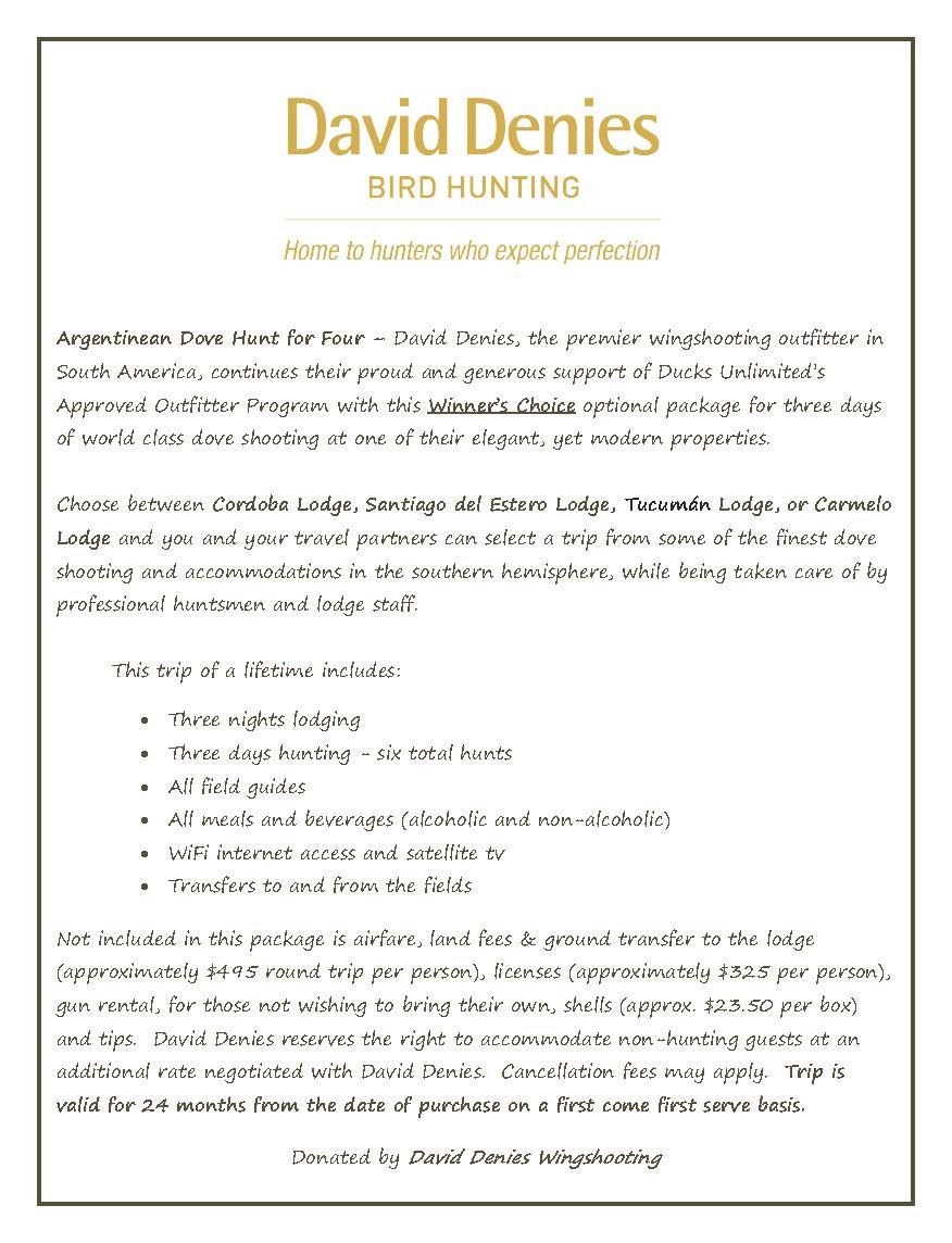 David Denies, the premier wingshooting outfitter in South America, continues their proud and generous support of Ducks Unlimited’s Approved Outfitter Program with this Winner’s Choice optional package for three days of world class dove shooting at one of their elegant, yet modern properties. Choose between Cordoba Lodge, Santiago del Estero Lodge, Tucumán Lodge, or Carmelo Lodge and you and your travel partners can select a trip from some of the finest dove shooting and accommodations in the southern hemisphere, while being taken care of by professional huntsmen and lodge staff. This trip of a lifetime includes: Three nights lodging, Three days hunting - six total hunts, All field guides, All meals and beverages (alcoholic and non-alcoholic), WiFi internet access and satellite tv, Transfers to and from the fields. Not included in this package is airfare, land fees & ground transfer to the lodge (approximately $495 round trip per person), licenses (approximately $325 per person), gun rental, for those not wishing to bring their own, shells (approx. $23.50 per box) and tips. David Denies reserves the right to accommodate non-hunting guests at an additional rate negotiated with David Denies. Cancellation fees may apply. Trip is valid for 24 months from the date of purchase on a first come first serve basis.