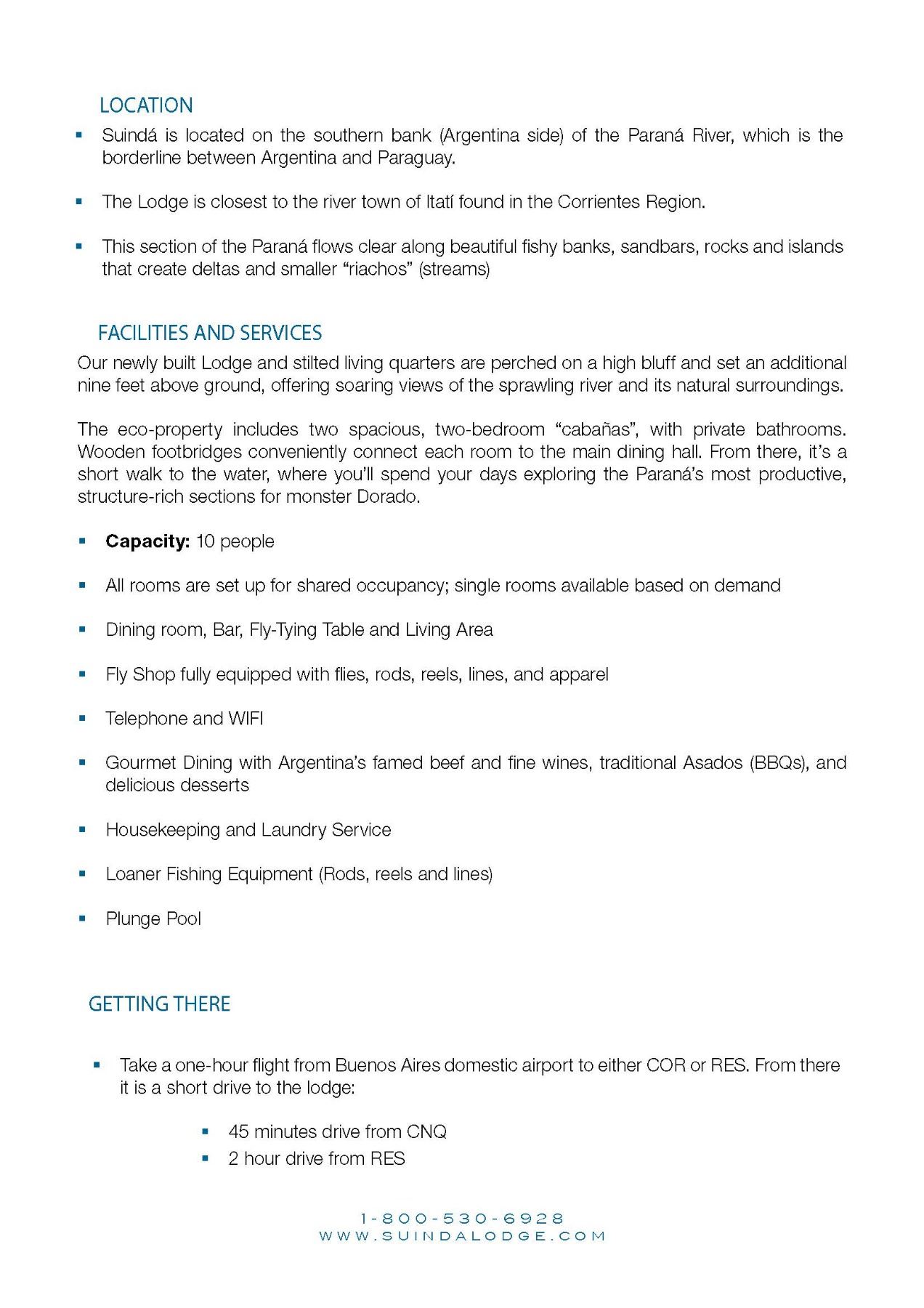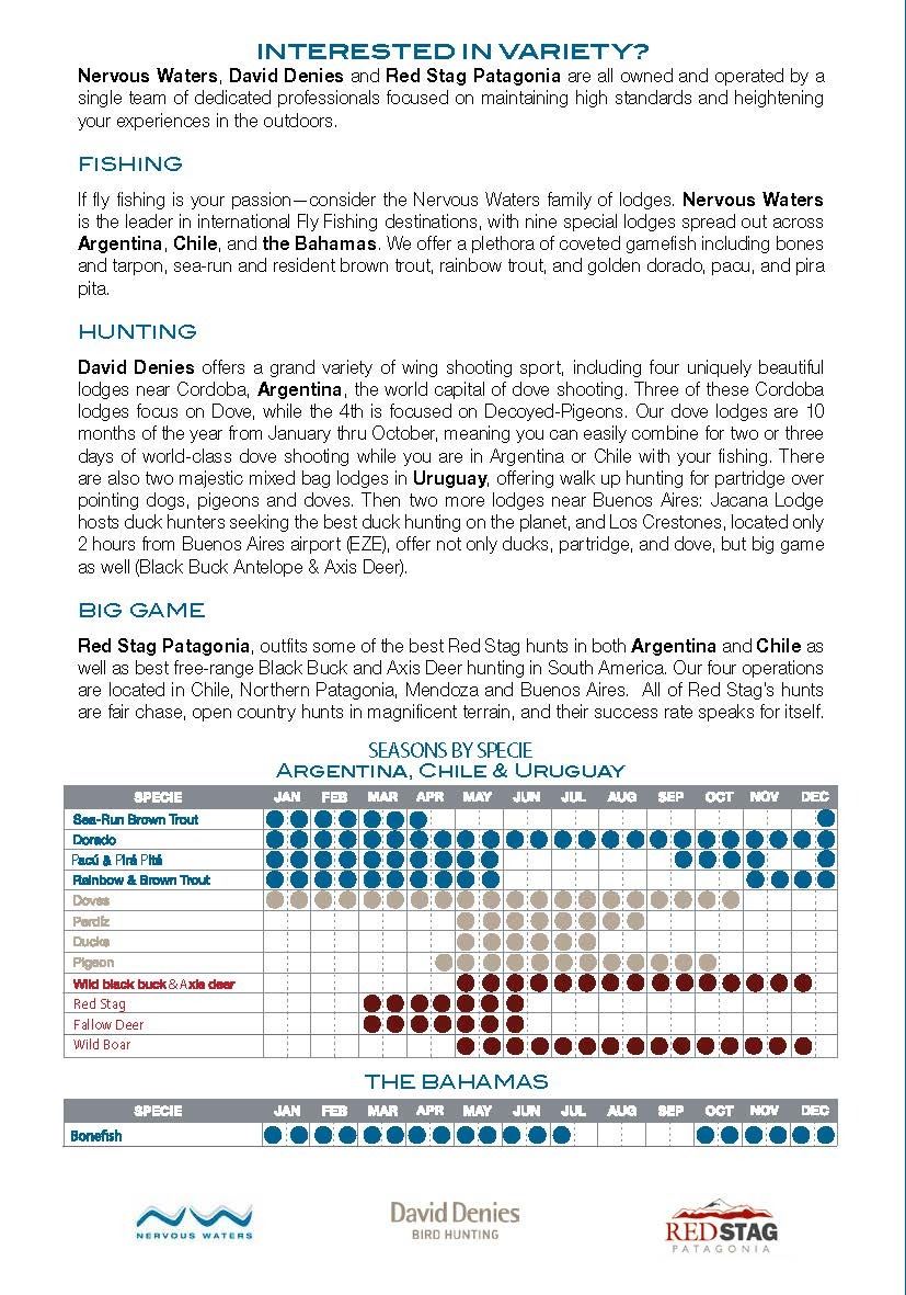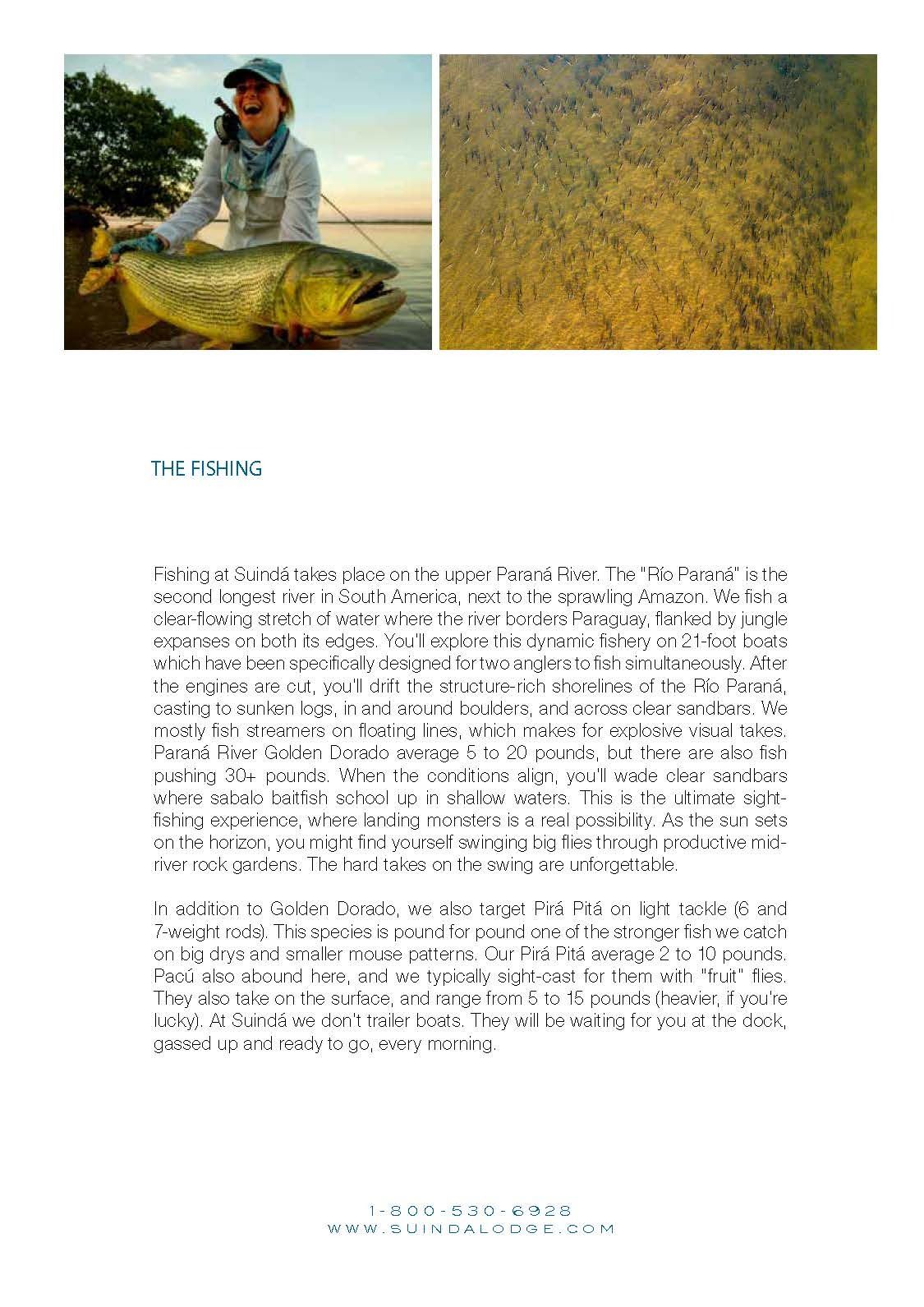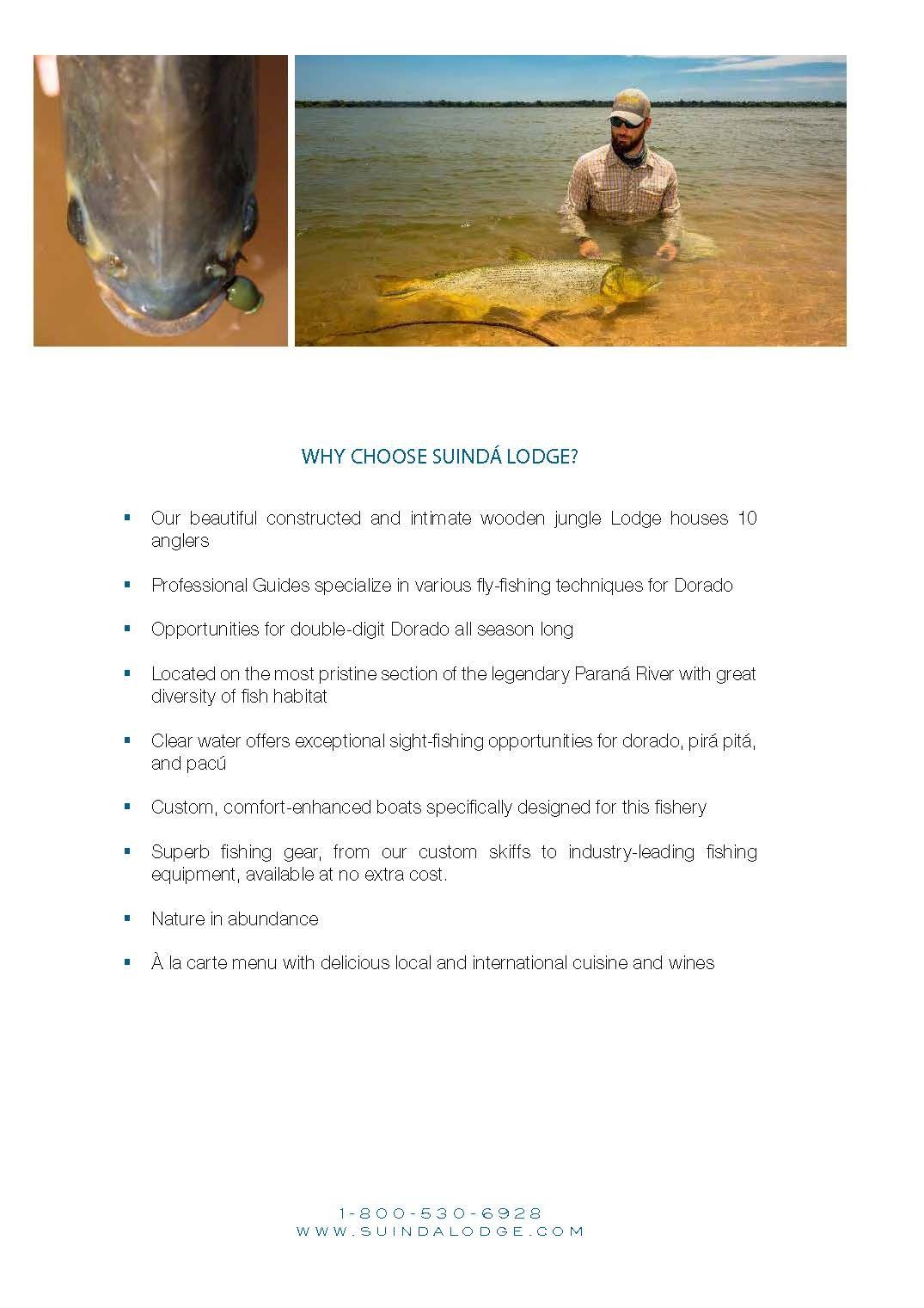 Cruise south to Itati, Argentina in the Corrientes province for three days of some of the finest fishing in the world at this Nervous Waters dorado fishing camp – Suinda (Swin– da) Lodge. Here, stilted living quarters perched on a bluff (some standing 9 feet above the ground) offer soaring views of the sprawling river and its natural surroundings. You and your travel partner will be treated to world renowned fishing and accommodations in this southern hemisphere paradise while being taken care of by professional fishermen and lodge staff. The lodge sits right on the edge of the Parana river’s most productive, structure-rich sections for monster dorado. The river marks the border between Argentina and Paraguay, and flows clear along beautiful sandbars, rocks and islands that create deltas and smaller “riachos” (streams). These clear waters offer exceptional sight-fishing for dorado. Professional guides specialize in fly fishing techniques, as well as gear fishing from custom, comfort-enhanced skiffs specifically designed for the Parana. Nervous Waters is one of the premier fishing outfitters in South America and you have an opportunity to experience this trip of a lifetime which includes: Three days of fishing, Four nights lodging (double occupancy), All fishing guides, meals, rooming & beverages (alcoholic and non alcoholic). Not included in this package: airfare, airport transfers (approx.. $200/person), fishing licenses (approx.. $50/person), fishing equipment rental ($150/person), facility services gratuities and guide gratuities. Cost associated with each of these items are the responsibility of the purchaser. These trips are non-transferrable without expressed written permission. Trip must be taken within 12 months of purchase.