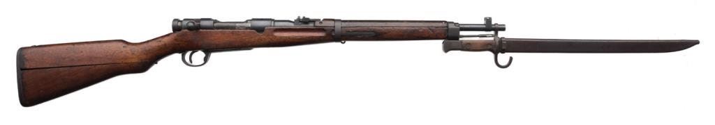**Arisaka Type 38 bolt action military rifle, 6.5mm caliber, 19.5” barrel, S/N 55938, full mum and Japanese characters present, very good bore, good wood with lamination separation at butt stock (common); crisp action; accompanied by a bayonet and metal sheath. Est.: $450-$650.