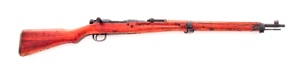 Arisaka Type 99 Bolt Action Rifle, #95774, 2nd Series, mfg'd at Nagoya Arsenal, 7.7mm cal., 25.5'' barrel, blue finish, hardwood stock, inverted ''V'' front sight with protective ears, folding leaf adjustable peep sight, knurled safety knob, with cleaning rod. Mum has been ground; Japanese ''Type 99'' characters are present. Front band and receiver with matching numbers. Condition is good. Metal with a combination darkened blue and browning finish. From the rear barrel band down there are some areas of scattered fine pitting. Receiver markings are clear. Wood with general dings and mars; buttstock with spots of putty type filler. Good action, fine bore with nice rifling. Est.: $150-$300. (C&R)