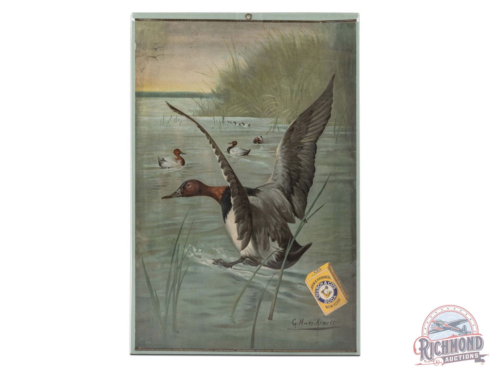 Nice canvas lithograph advertising sign featuring a landing Redhead duck, several Redheads in the background on the water and an early box of Arm & Hammer Soda. Great color and eye appeal. There are multiple creases and tears of various sizes, several with repair and some touch up, predominately spanning from wingtip to wingtip. Some similar wear and tear along the right and at each band. Includes top and bottom band. Shrink wrapped and secured to foamboard. Marked at bottom left Copyright 1905 by Church & Dwight Co NY with artist signature printed on the bottom right. 25.25" H x 17" W.