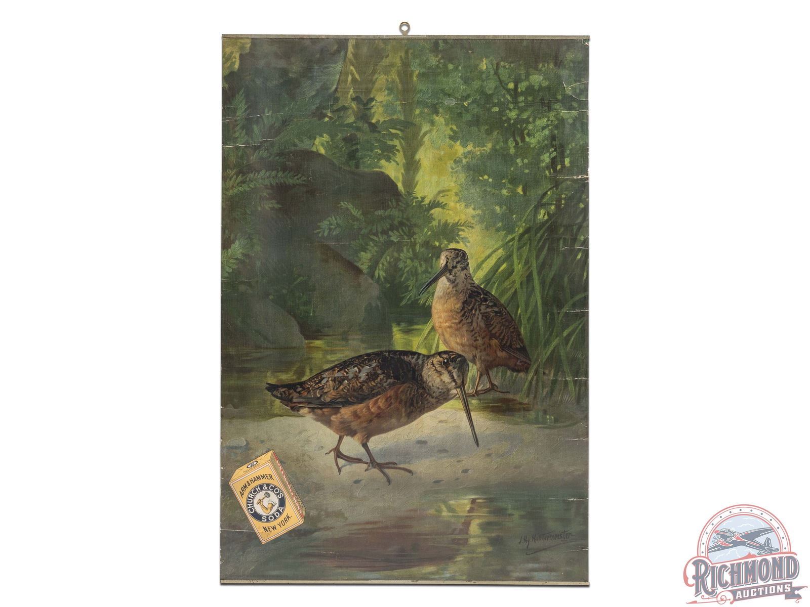 Nice canvas lithograph advertising sign featuring a pair of Woodcocks in the wild by renowned artist John Henry Hintermeister and an early box of Arm & Hammer Soda. Multiple horizontal creases throughout with edge wear and some tears. Includes top and bottom bands. Shrink wrapped and secured to foamboard. Marked Copyright 1910 by Church & Dwight Co on bottom left corner with artist signature printed on right. 25" H x 17" W.