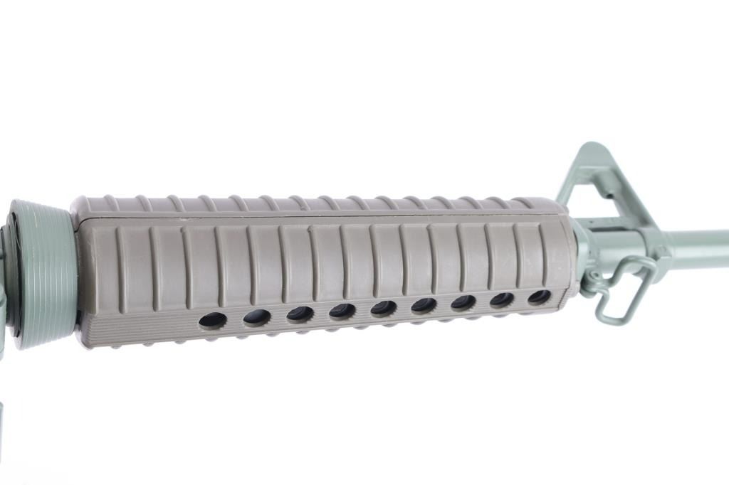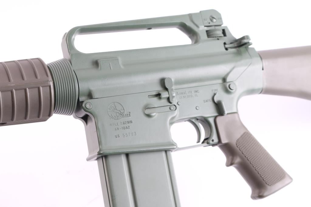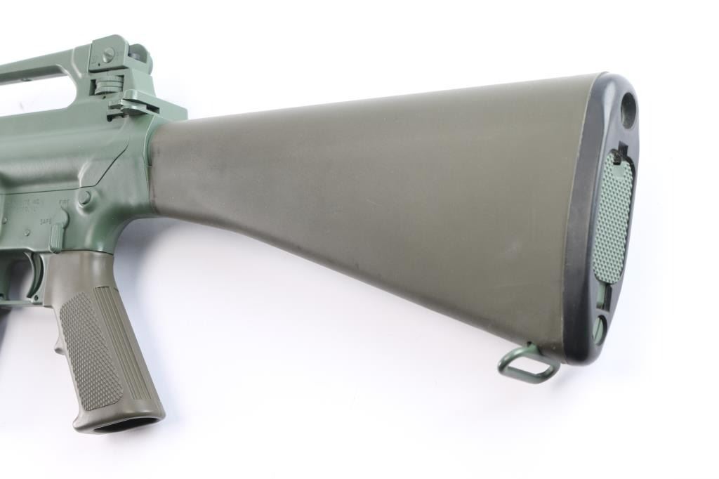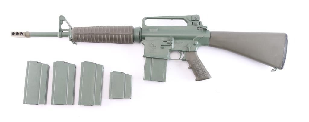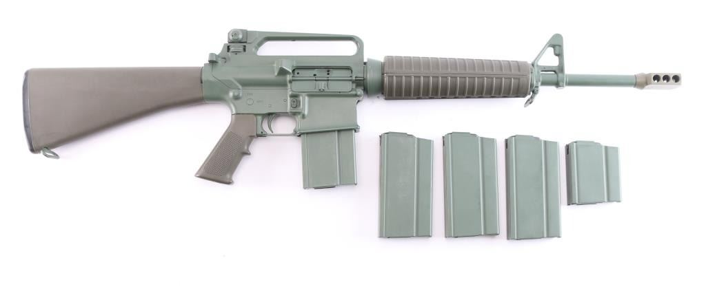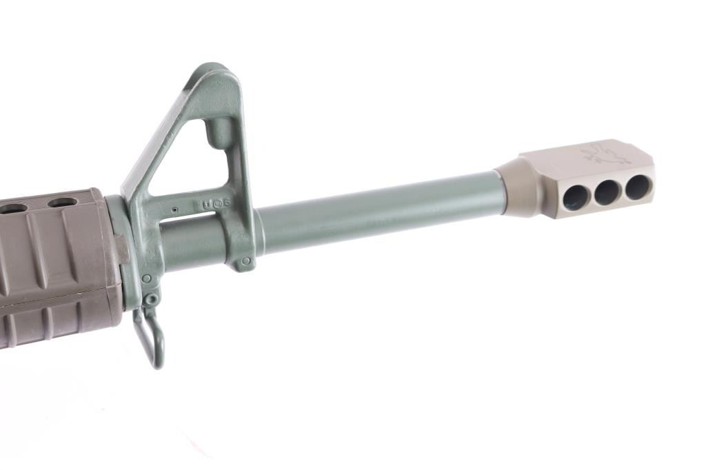 Semiautomatic carbine chambered for 7.62x51mm (308 Winchester). Features 16" stainless steel barrel, LRK dark flat earth 'Tanker' style six port muzzle brake, A2 style adjustable sights with protected post front and peep rear, manual safety, spring loaded ejection port cover, "carry handle" style upper receiver with shell deflector for right handed shooting, OEM green furniture with A2 pistol grip, and trapdoor storage compartment in A2 butt. Entire metal finish, including internal parts, magazines and controls is Armalite Green This model does not have bayonet lug; does not have forward assist. Bore is excellent. Finish is about 98%. Plastic furniture is excellent condition with minor handling marks. Comes with four 20-rd magazines and one 10-rd magazines. Mid to late 1990's "Post Ban" carbine. Condition is NRA Excellent. Modern Firearm.