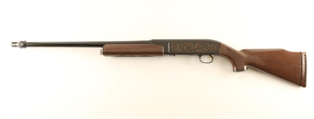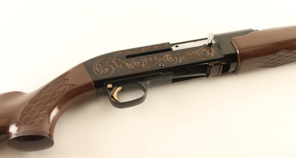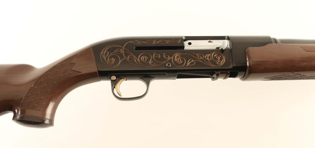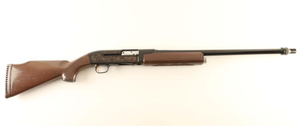 Innovative & lightweight recoil operated semi-automatic shotgun chambered for 2 3/4" 12 gauge shells, manufactured in Costa Mesa, CA circa 1964-1965. The AR-17 did not receive commercial success and only 2,000 were produced. Features a glossy black finish, 22" high-strength aluminum barrel with thread-on choke tube, red bead front sight, smooth gold trigger, cross-bolt safety, steel bolt with serrated charging handle, two round capacity, aluminum receiver with gold filled roll stamped vine scroll, skip-line checkered faux-wood nylon forend and semi-pistol grip Monte Carlo shoulder stock with contrasting grip cap, factory recoil pad & 14 3/8” LOP. Shotgun retains approximately 98% of its black finish showing light wear and a couple small losses. Action is sound, the bore is excellent and the synthetic stocks are very good with scratches & scuffs. Condition is NRA Very Good to Excellent. ***C&R Firearm***